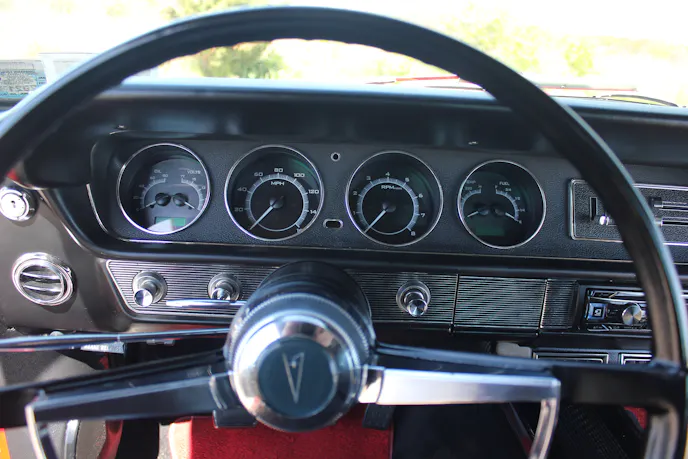 Batting cleanup, Steve flew to Oklahoma, where he laid eyes on a two-owner, 265,000-mile example. Originally a factory Iris Mist, the 389 cubic-inch engine, four-barrel carburetor, four-speed car had a 3.36:1 axle rear and no power steering. The second owner had fully restored the Goat in 1998, including stunning Torch Red paint, adding power brakes, and dropping in a RamAir III 400 cubic-inch Pontiac V8.