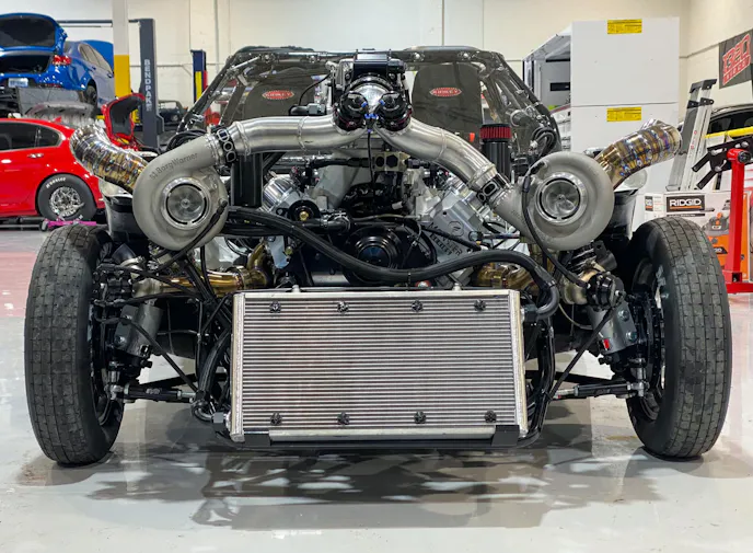 Like the chassis, the turbo kit is a work of art as well. Koza used their own Ls Turbo Manifold kit built in house by their employee Zack Keller. They then re-worked a set of Borg-Warner borg warner 69/7X turbos, with Precision Turbo & Engine wastegates and blow-off valves. Street Carr Fabrication took care of the turbo flanges, and the cold side merge. The team then topped it off with a killer set of titanium downpipes.
