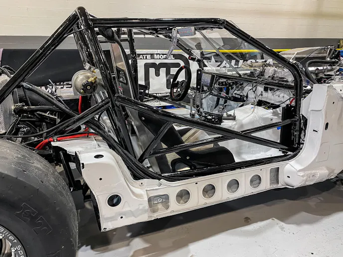 The chassis on this car, or what’s of the vehicle, is a work of art. Koza removed the road race cage that was installed originally and built a new one specifically for drag racing. The Mazda’s entire rear was cut off and replaced with a Camaro SS rear cradle and ZL1 differential. Thomas Hendrix is responsible for a set of “one-off” solid cradle and differential bushings to ensure the perfect pinion angle. Koza didn’t stop there with the in-house fabrication either. The front of the ex-Miata was modified with a Fox Body K-member and complete Mustang style suspension. The guys then altered a set of QA1 shocks by disassembling and shortening them to maintain the correct geometry for the car.