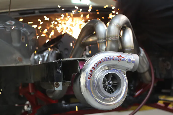 Big power, in 2011, which was the second revival of the project, meant anything north of 1,000 horsepower and we thought it would be cool to do that with small cubes, high-RPM, and a single turbo on lots of boost. The turbo kit is the wildest and most obvious part of the build, which was built to look cool and make as much power as possible while shooting the biggest flames we could muster. A single Turbonetics Y2K 88mm Turbocharger – hey now, we told you this build started ten years ago – serves as the compressor, turning hot air into horsepower potential. A matching Turbonetics wastegate, blow-off valve, and air-to-liquid intercooler were chosen to manage air in various ways; the wastegate controls exhaust gas into the turbine, the blow-off valve manages compressed air heading into and back out of the intake, and the intercooler converts stupid-hot air into ice-cold burnout juice, in technical terms. But the main artwork here – and the reason you need to always select and pay for the best fabricator you can afford – is the turbo kit itself. It’s truly fascinating to watch a master fabricator turn a pile of 90-degree bends into something that works and looks this good, and Vengeance Racing has the best of the best.