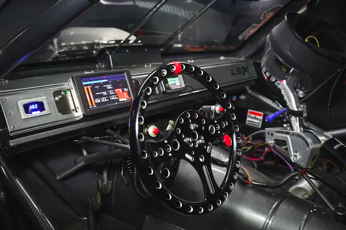 The tube chassis was initially set up for a big-block Chrysler engine, but at this point in Chris’s racing career, he had already made a move to LS-based motors with stand-alone electronic fuel injection. He quickly modified the chassis to accept an LS-powerplant. Chris put in 1,050 hours of his own time into the car. He had to upgrade the chassis from an 8.50 certified cage to 7.50. The car needed more than just plumbing and wiring — it needed bodywork, suspension, paint, and windows. Everything from the front bumper to the rear wheelie bars needed to be tightened up.