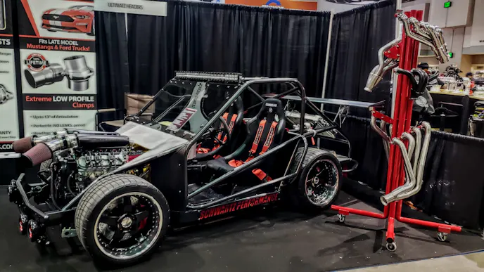 Making its debut at the Ultimate Headers booth at PRI, the Schwartz Performance exo-kart drew a ton of attention, and not just because of its one-off chassis or all that fabrication, but to the parts resting inside its exposed frame as well. Part performance monster, part rolling display booth, the Schwartz Performance Skart is without question one of the coolest micro machines we’ve ever seen, and apparently, we aren’t the only ones ogling it.