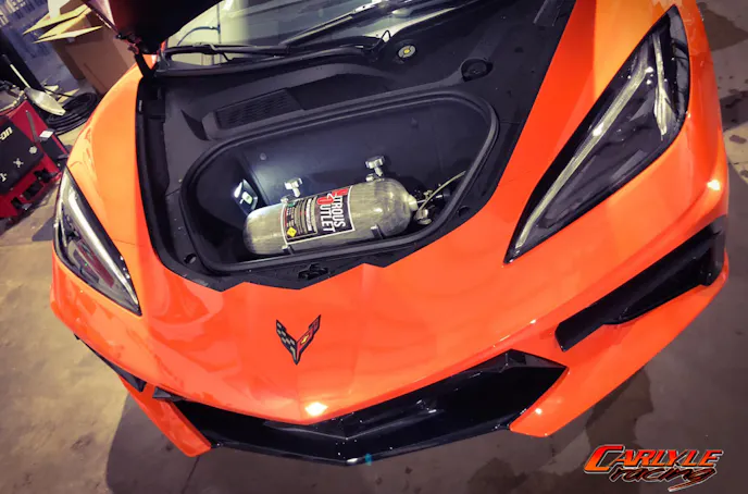 With the C8 off of the rollers, Mark Carlyle, owner of Carlyle Racing, wanted to see if a nitrous bottle would fit in the cargo area. Since he had a used system setting on a shelf, he grabbed the bottle and brackets and set them in the Corvette. One of his employees took advantage of the test fit and snapped a quick picture that was posted online with the caption, “Guys don’t tell Mark D Carlyle about this…” What started as a joke soon turned serious as images of the C8 went viral with a composite Nitrous Outlet bottle dummied up in the car. Mark said, ” After everyone saw the picture, they went crazy. It was at that point I knew we had to spray it.”