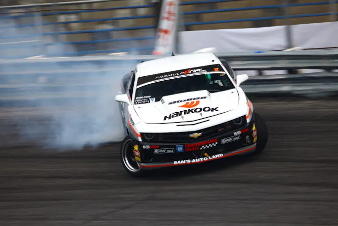 This past weekend Conrad Grunewald showed the Formula DRIFT series that he means business by sliding the Hankook Tires Camaro SS all the way to his very first series victory in Round 4: The Gauntlet. Regardless of how you feel about drifting, LS engines are dominating the sport, and the Hankook Camaro is undeniably a force to be reckoned with. Under all those graphics are a set of Forgeline ZX3R wheels, wrapped in some fat 305/30/19 Ventus R-S3 tires. The 715HP LS7 under the hood is more than happy to reduce those big meats into billowing clouds of white smoke.