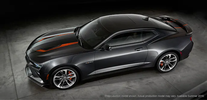 Unique paint colors and specialized wheels are solid mainstays of anniversary packages, but there is more to it here when it comes to one of the more important cars for many enthusiasts. This includes a specific 50th-Anniversary stripe package, exterior badges, and a unique grille with satin chrome accents. There is also a body-color front splitter, orange brake calipers (front only on 2LT V-6 cars) and a unique black leather interior with suede inserts and orange accent stitching. Also inside will be distinct 50th-Anniversary treatments on the instrument panel, seatbacks, steering wheel, and illuminated sill plates.