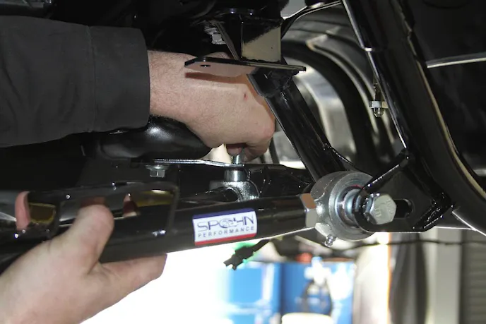 The lower control arms are really where the additional adjustability really comes into play. Spohn tells us, “The lower a-arm alignment slots on our k-member are longer both ways than the factory k-member so you have more front end alignment adjustment available. Also, the rod ends or Del-Sphere pivot joints thread in, so you can change the length of the a-arms for track width changes if you need to.”