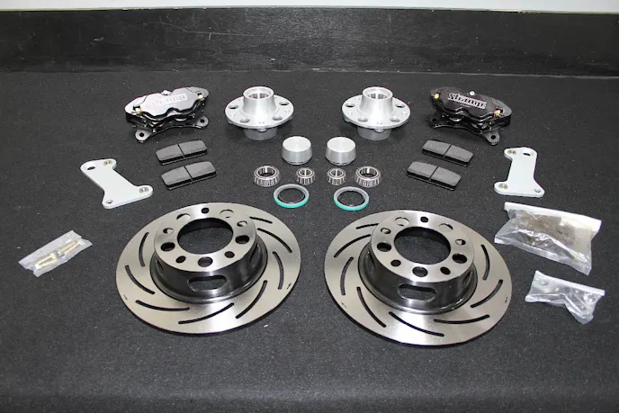 The calipers in Strange’s kit are forged aluminum, staggered 4-piston units, teamed up with billet aluminum brackets and hubs for a combination of low weight and high strength. As a testament to their effectiveness, these same Strange 4-piston calipers and rotors are the heart of the drag brake kits are standard equipment on the Cobra Jet and COPO Camaros.