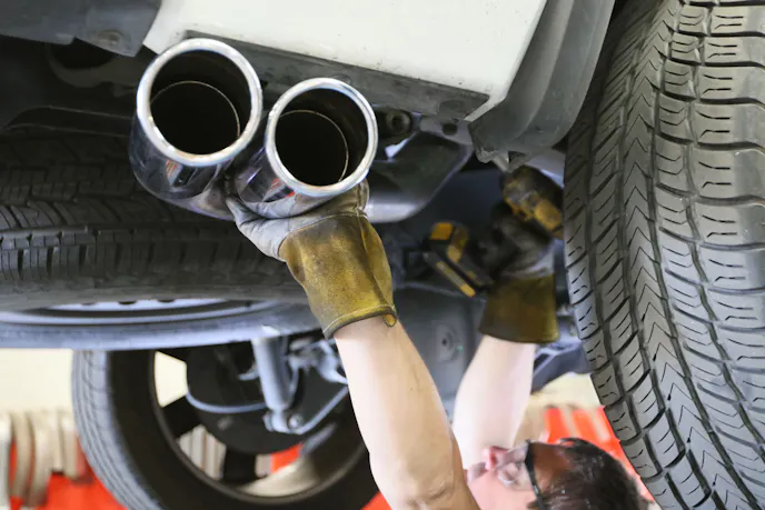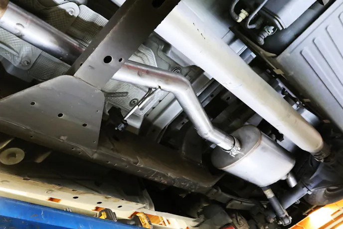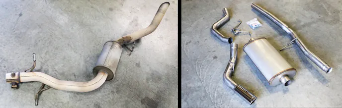 The first step in installing a new exhaust system is getting a vehicle up in the air and getting dirty pulling off the old exhaust system. We cut the exhaust with a reciprocating saw to help remove the pipes around the rear axle. The stock system comes with a resonator and a muffler with a fairly restrictive valve. The JBA exhaust comes with a single muffler with two internal perforated tubes for a more free-flowing exhaust.