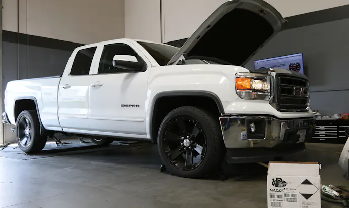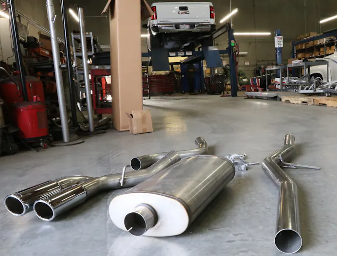 I think most of us will agree a white Chevrolet/GMC pickup going down the freeway isn’t something to get very excited about. The reality is these pickups are a dime a dozen. Knowing that a white pickup truck is almost invisible, we decided we wanted to add a little more sex appeal to our GMC Sierra. We started by adding an emissions-legal ProCharger, which bumped up the truck’s power from 260 horsepower and 281 lb-ft to a healthier 419 horsepower and 422 lb-ft of torque. And while we’re happy with the newfound gains, we can’t help but think the factory exhaust system could be a hindrance. So our next step was to find a great-sounding exhaust in hopes to free up a few more ponies. However, we wanted to update the exhaust so that it would remain smog-legal in California.