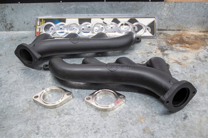 The first order of business was to get rid of the ugly factory cast truck manifolds. While these units can be cleaned up with a grinder and some elbow grease, the outlet side of these units doesn’t always point where they need to on an LS swap. Hooker Blackheart (PN 8502-3HKR) offers a nice set of cast iron manifolds that are much more friendly when it comes to an engine swap. They’re available in a natural or black finish and come with flanges for the exhaust system. We chose the black manifolds over the natural finish units for this project. The manifolds went on with no problem, and we used Mr. Gasket gaskets and 12-point ARP bolts to seal them up.