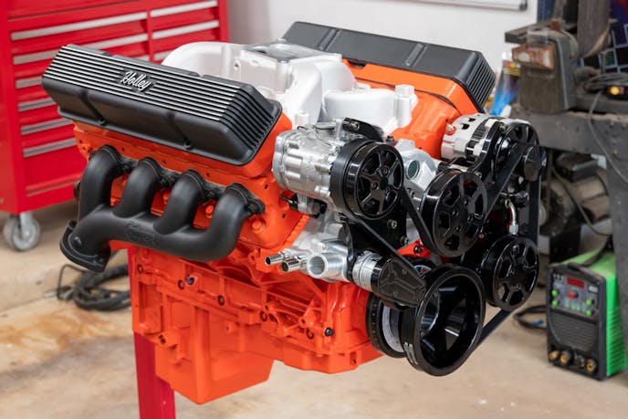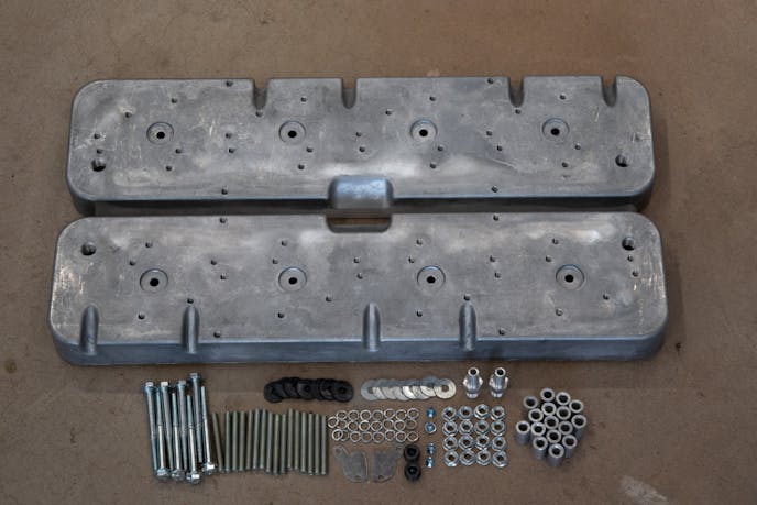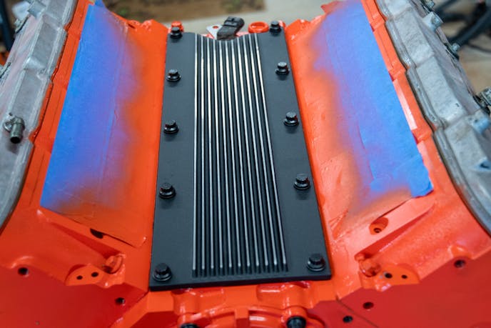 The LS valve covers are not very attractive, even with the coils removed and relocated. To combat this problem, we ordered a set of small-block valve cover adapters from Holley (PN 241-298). Since our units were cast aluminum, we had to paint them Hugger Orange to match the engine. After the paint dried, we swapped out the factory covers for the Holley adapters, which allows us to utilize the old small-block Chevrolet valve covers in place of the OEM units. Another great feature of this setup is that the new valve covers will hide our coil packs.