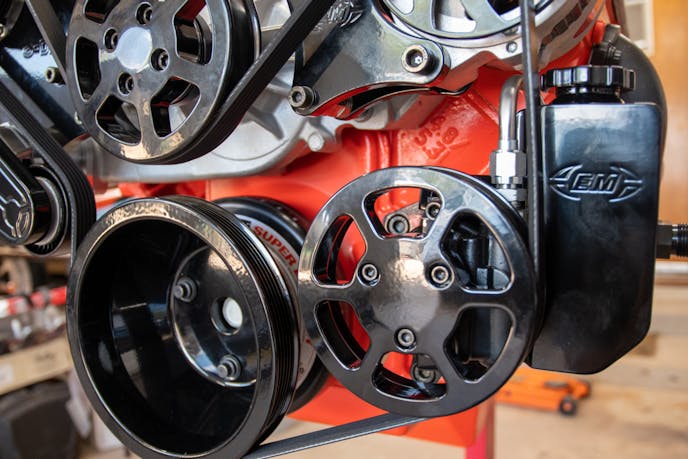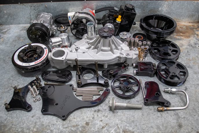If you’re going for that classic look, the factory accessory drive system doesn’t look the part. While the OEM pieces are robust and reliable, they’re also bulky and less than attractive. To address this problem, we made a call to Eddie Motorsports and ordered one of its S-Drive accessory drive units. This unit is designed to bolt on to the LS family of engines and replaces the factory water pump, power steering pump, alternator, and A/C compressor, if equipped. This product is available in several different combinations and finishes. And While the Raven Series is the most popular choice, for our project, we chose the gloss black combined with a natural finish, meaning all of the accessories are natural cast aluminum, for a 1960’s OEM look.
