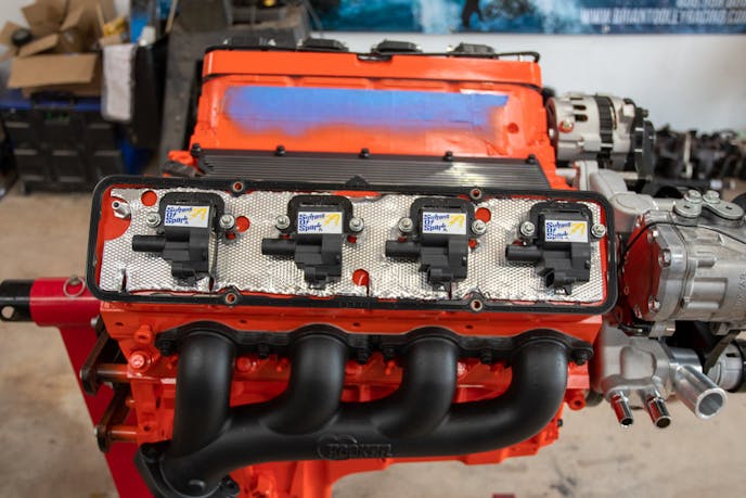 DEI offers a product called the LS Coil Pack Heat Shield. These are designed to solve the problem of coil failure from extreme engine heat. And since we’re covering the coils with SBC valve covers, we want to shield as much of that heat as possible. The LS Engine Coil Pack Heat Shields are a semi-rigid shield made from double-sided aluminum and high-temperature foam core, which insulates and reflects heat away to extend the coils’ life. The sheets come pre-cut for the factory LS coil packs, but are easy to trim.