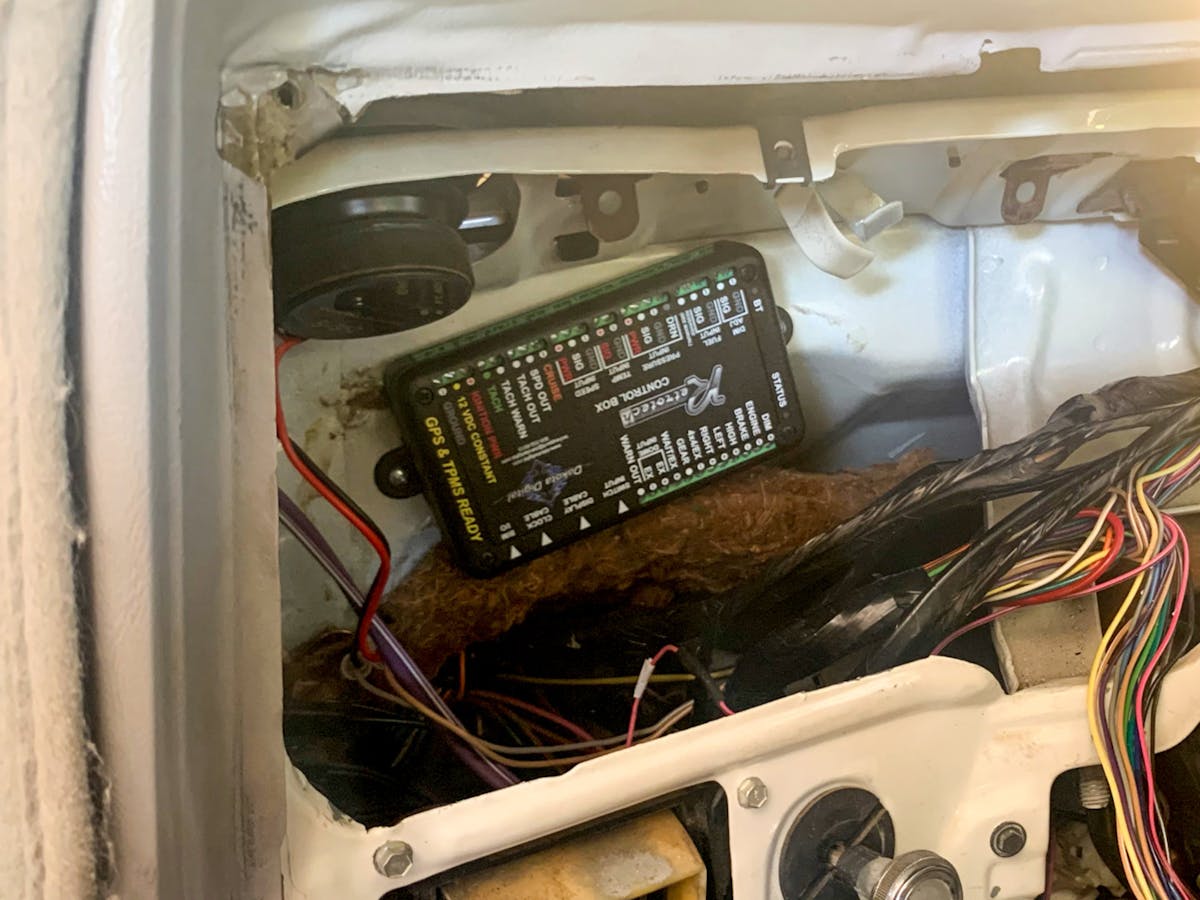 With all of the wires routed and cleaned up, it was time to finish the installation and put the dash back together. After mounting the warning buzzer, we plugged it into the back of the cluster. We also routed the cable from the box to the gauges, which makes wiring simple. We then plugged in the OBD-II connector and attached the other end to the BIM module we previously connected to the control box. Next, we installed the toggle switch that will allow us to program the gauges and toggle through different displays of engine vitals. Finally, we set the new cluster in its position, but we didn’t button everything up just yet. Instead, we decided to program the gauges and ensure everything was functional before putting the interior pieces back together.