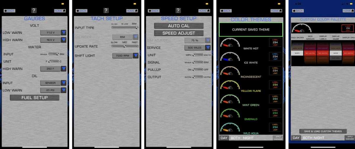 Programming the gauges can be accomplished in one of two ways. The first method for programming is done by using the ‘I/O’ toggle switch. We held down the toggle per the instructions with the ignition off and put the key to the “ON” location. This action puts the gauges in setup mode. From there, you will scroll through the menu displayed on the TFT screen and set the parameters. The second method, which we prefer, required us to download an app for our mobile device, turning it into a tuning tool for the cluster. This route makes changing the gauge settings a snap, and it’s much quicker than the first method.