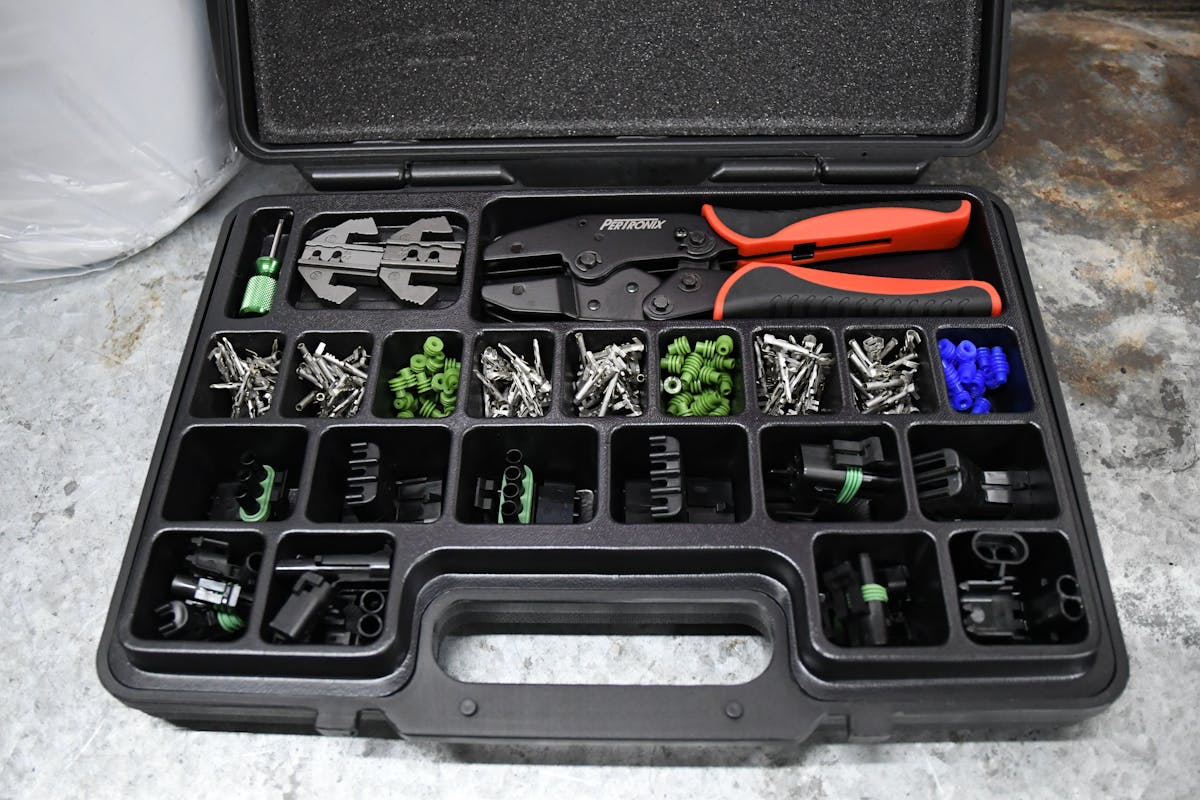 We then took the solenoids, and instead of using the supplied electrical connectors, we opted for a GM Weather Pack connector. These connectors not only make for a clean installation, but it also allows for quick removal, and they look factory under the hood. We used the four-terminal connectors from our Pertronix weather pack kit. This assortment gives you different options for the connection type and wire size, and the crimpers ensure a perfect connection between the terminal and wire every time. Best of all, Weather Packs keep the elements out so we don’t need to worry about corrosion or the wires breaking down.