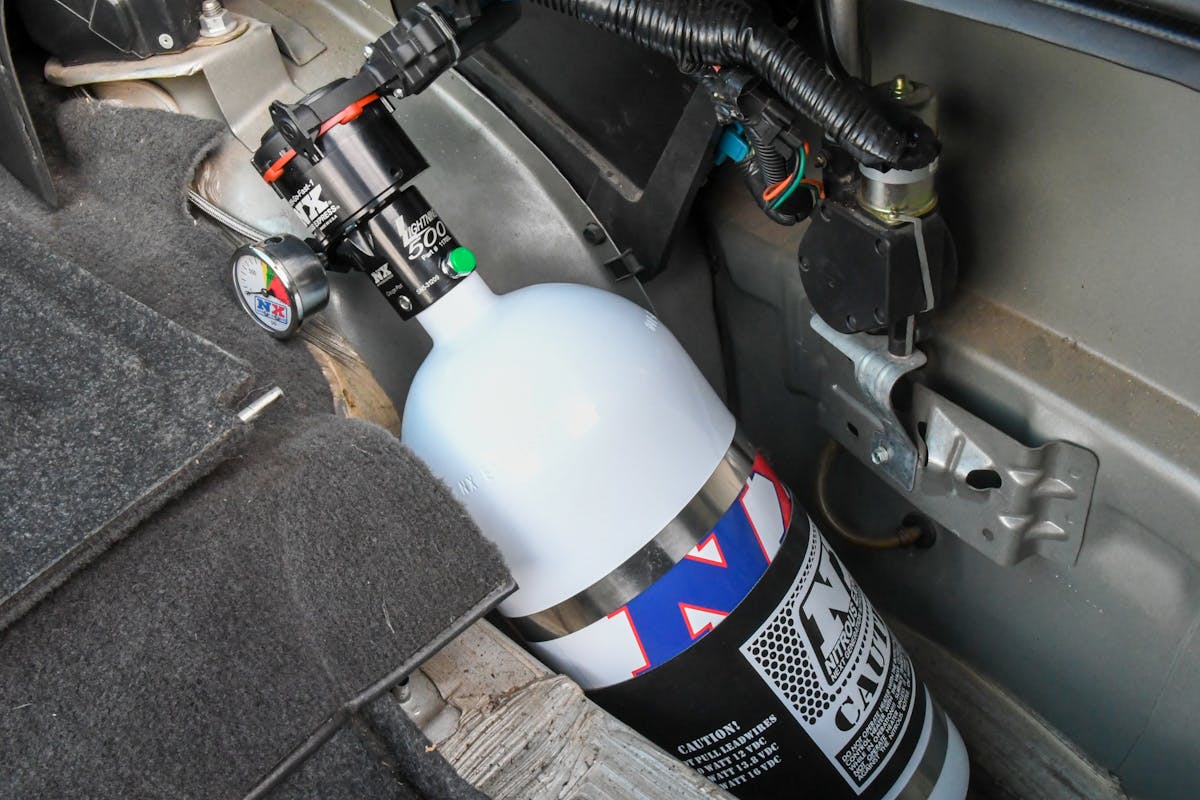 If you want a consistent-performing nitrous system, bottle pressure is extremely important. If the pressure is too high, the solenoid may not open. If too low, the system will surge, run rich, and not make the proper power. To cure this ailment, we installed a nitrous pressure gauge on the bottle, along with an automatic bottle heater.