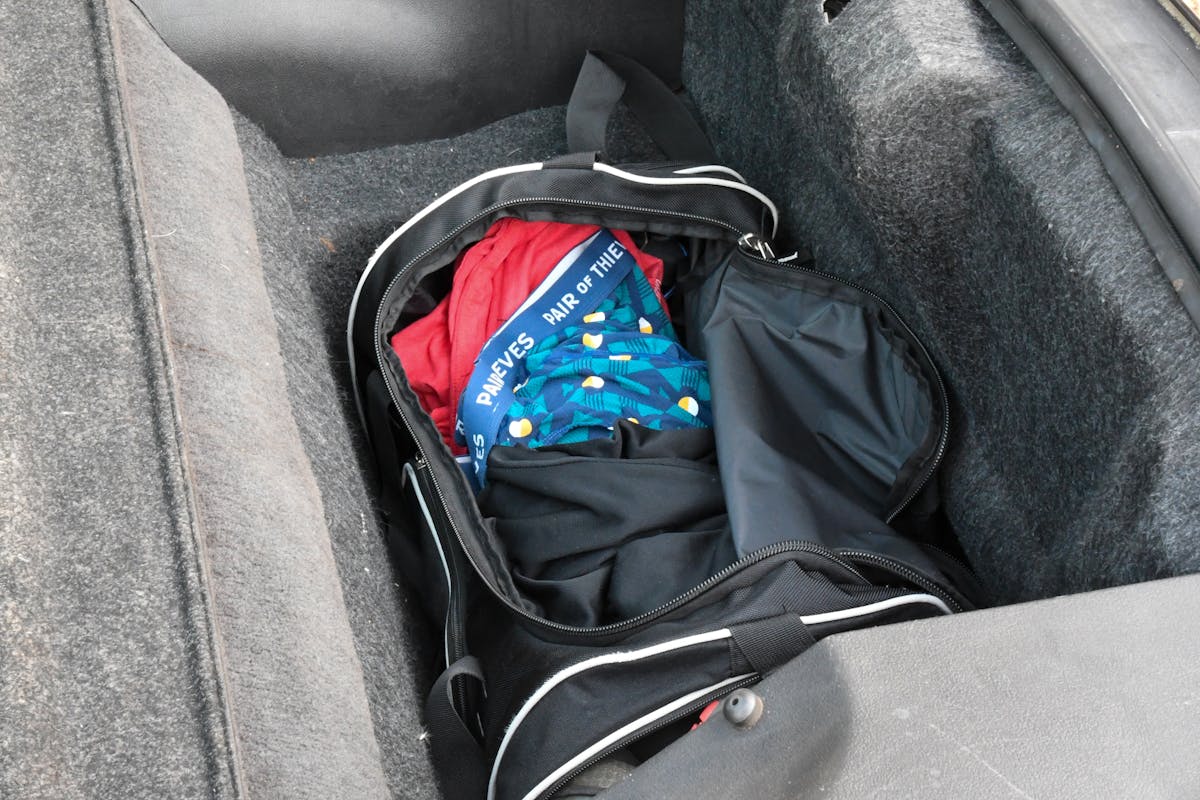 Here is another great solution to conceal your true intentions. Use an old gym bag to hide the bottle. Depending on its size, you can find a bottle that will fit inside. We had an old duffle bag lying around, and it housed a 15-pound bottle effortlessly. With the bottle in place, just add your gym clothes, shoes, and anything else you might take to the gym. We made sure a Pair Of Thieves brand underwear is the first thing people would see if the bag was opened. There’s nothing like a pair of silky used undies with polka dots to keep someone at bay if they decide to reach in the bag. Just make sure the bag is positioned in a normal spot. Most F-body owners would not keep it under the back hatch, but it still looks in place.