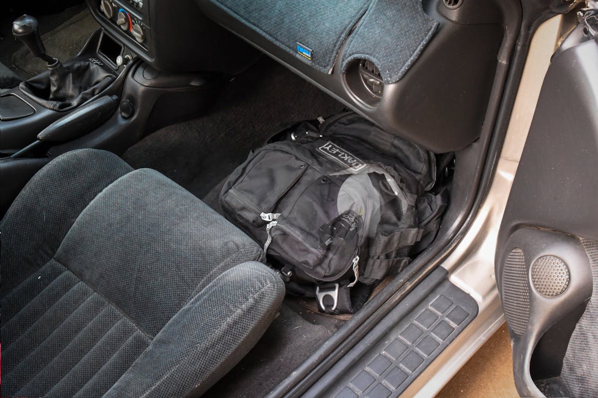 Can you fit a bottle in a backpack? You bet! You just need to either get a big backpack or downsize your nitrous bottle. We found that if we used a 5-pound unit in our Oakley bag, it still allowed room for mints, gum, car cleaning supplies, and our laptop for “tuning.” An excellent advantage of mounting the bottle in the passenger floorboard, you can quickly turn the valve on and off from the driver’s seat if needed.
