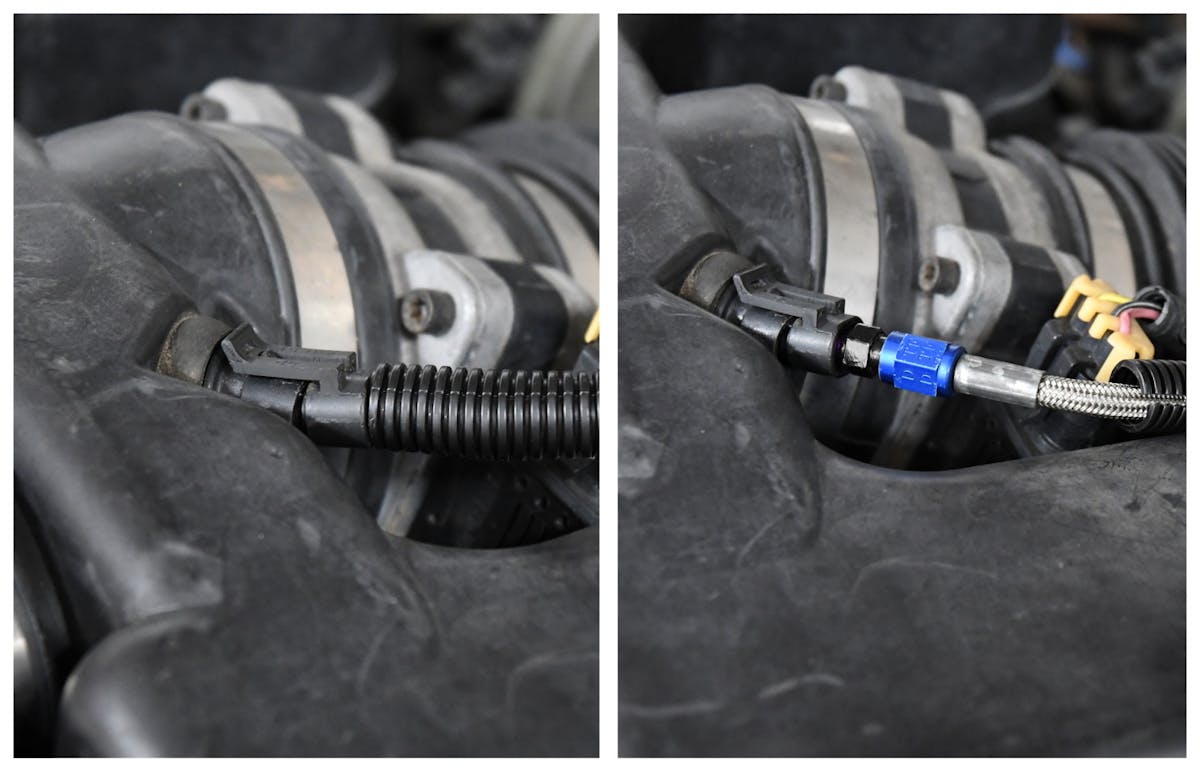 One of the drawbacks of wet systems is fuel delivery. If we weren’t trying to hide the system, this is an easy task on the fourth-gen. The factory-supplied a fuel test port on the fuel rail. However, this would be a dead giveaway, so we had to come up with another solution. We decided to tee off the fuel line and then run a hose to the fuel solenoid. Is this method foolproof? No, but it’s the safest way to pull the fuel while being discrete. We could put a splice in the main fuel line, but we didn’t want to cut the factory line. There are more options to evaluate — take your time, and choose wisely.