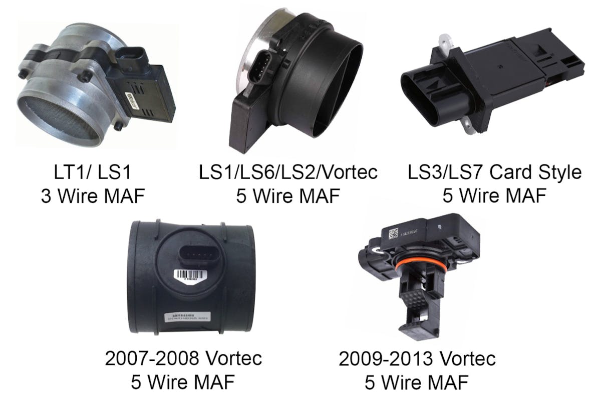 The mass airflow sensor (MAF) is another important tuning tool used by the ECU in both the Gen III and Gen IV LS engines. The one used on an LS1 offered aluminum ends which sandwiched a three-pin sensor. The LS2, LS6, and Vortec engines all utilized a one-piece five-wire design. In 2007 GM ditched this design and opted for a different five-wire unit for the 07-08 Vortech and Holden engines. More changes came with the LS3 and LS7 as they were a card-style MAF instead of the traditional round one. In 2009 Chevrolet broke the mold again for the Vortec and CTS-V LSA engines with another new five-wire MAF. To add to the confusion, the MAF for the Express Van from 2003-2013 is also specific to the vehicle but some of the early model Gen III van engines came with the Vortec five-wire MAF.