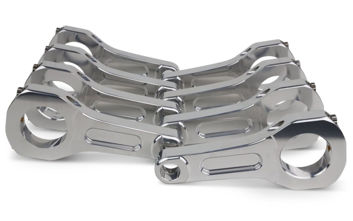 Instead of the typical forged steel, these are machined out of billet aluminum with a robust solid design resembling a support girder for a high-rise bridge. Measuring 6.185 inches in length, we needed the strength and weight savings an aluminum rod has to offer. On the big end, the MGP Pro 2500 series aluminum rods feature full radial serrations where the cap meets the body of the rod and custom-made ARP 7/16-inch rod bolts to ensure zero cap movement. The small end does not have a typical bronze bushing for the wrist pin, but a proprietary MGP “Hard Bore” process that provides a hardened surface of the aluminum in the bore for reduced wear and bore deformation.