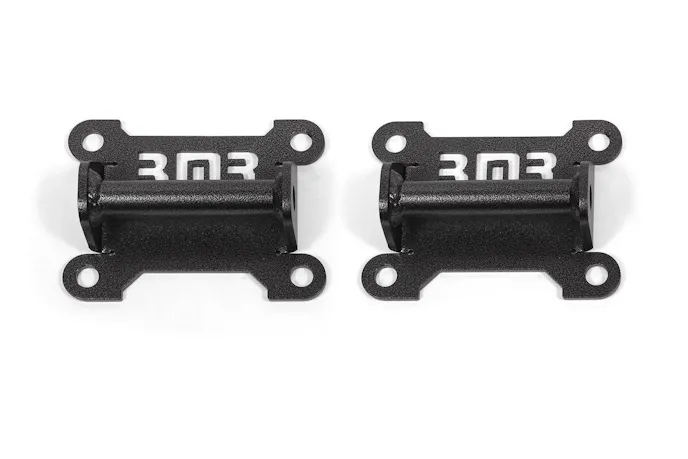 The OEM mounts are made of rubber and are designed to absorb noise and vibration, offering a smooth ride. The problem is, the factory mounts do little for performance, especially if they’re worn out. BMR’s Motor Mounts (PN MM340) are made with 95-durometer polyurethane bushings and 1/4-inch laser-cut steel plates offering uncompromised strength and durability. These mounts significantly reduce engine movement when compared to the OEM parts with little change with noise, vibration, and harshness (NVH). Unlike rubber, polyurethane bushings allow the engine to react quicker, which is perfect for street performance and drag racing.
