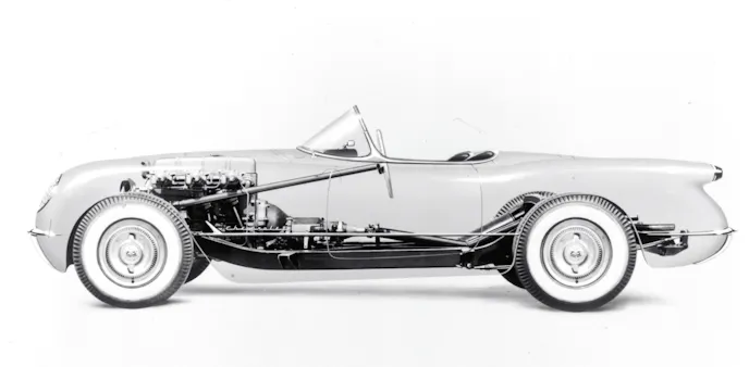 Corvette started out with a very conventional front-engine design, but it wasn’t long before engineers were looking at alternative locations for their engines. Photo: GM Archives