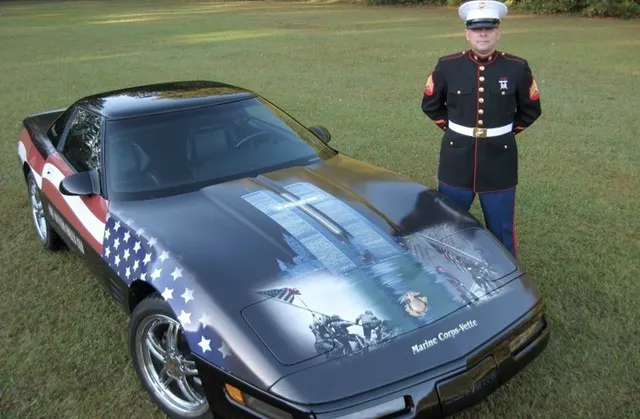 The C4 “Marine Corps-Vette” is the project of former marine David Sommerdorf. An evangelist, Sommerdorf travels the country in the tribute Corvette encouraging people to remember the victims of September 11th, honoring our troops and spreading his religious views. Sommerdorf was in Battery Park in New York on September 11th to share his moving memorial.