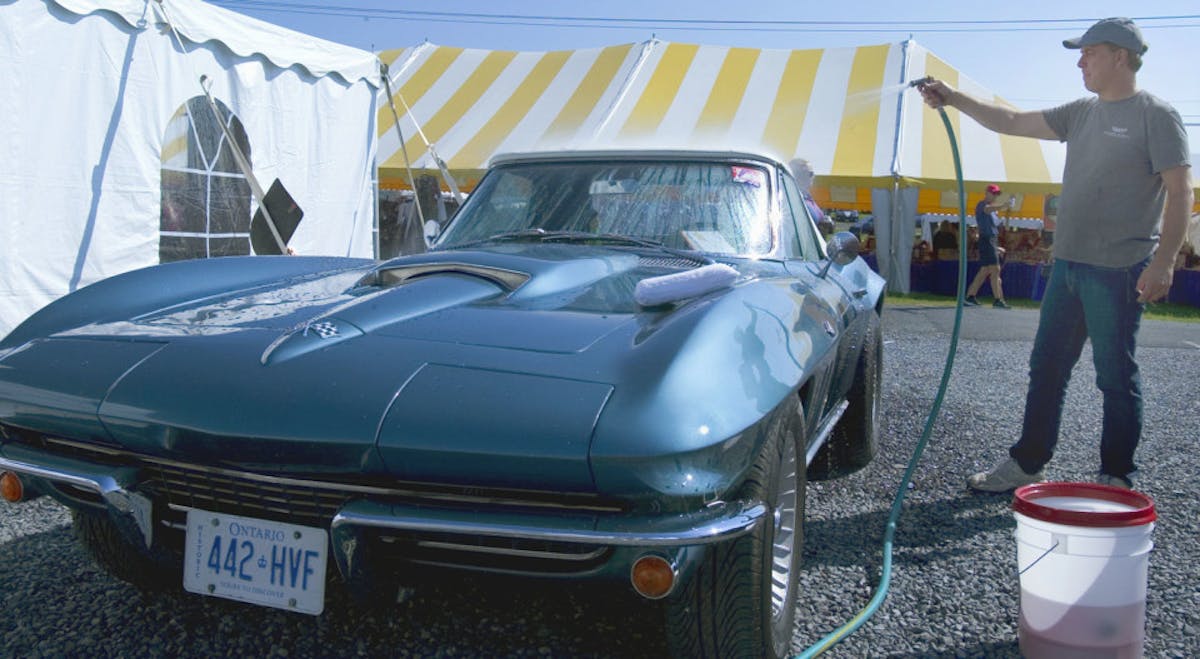 After a long road trip down from Canada, Paul Marentette takes time to wash and detail his 1965 Corvette.