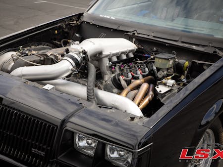 One of the more rowdy LS-swapped cars in the pits was a 1990 Mazda Miata owned by Peter Chavez out of Redlands, California. The 445 cubic-inch ProCharged LS engine was built by Hustler Racing engines out of Riverside, California. A Turbo 400 transmission with a Coan torque convertor transfers all of the power to the rear wheels, while the 4-link suspension keeps the tires hooked up. Chavez uses Torco E85, which allows the little 90-inch wheel-based two-seater to crank out 1,200 horsepower at the wheels with a Holley Dominator ECU. The best pass so far 7.97 in the 1/4 at 178 mph, with only 31-pounds of boost. Chavez said, “You will know if the car is going to go straight in the first 60-feet.”