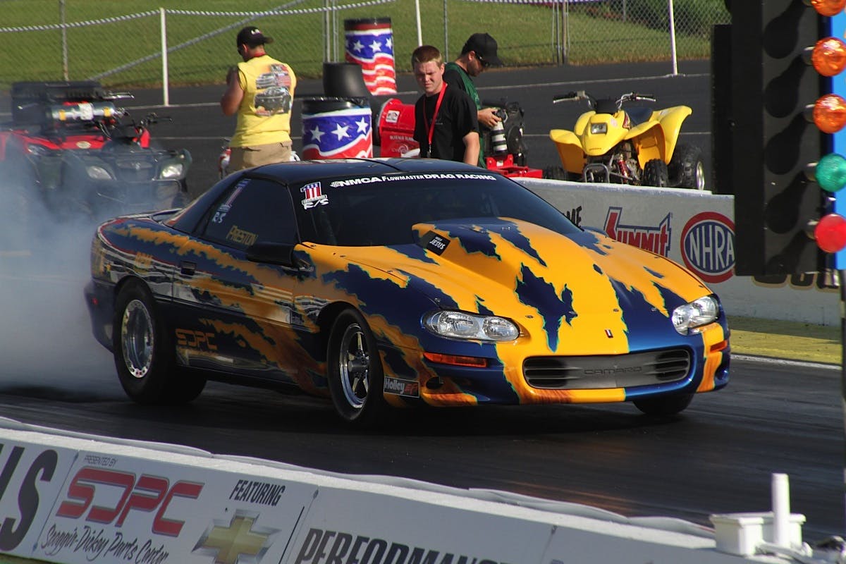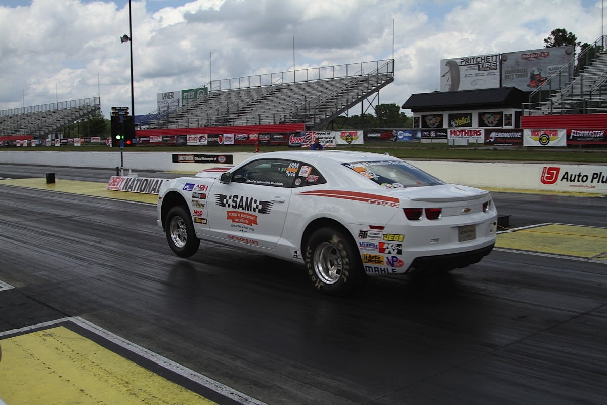 Brian Massingill is piloting the School of Automotive Machinists’ 2012 COPO Camaro this weekend. The #29 out of 69 is a naturally-aspirated 427 (of course, since the SAM team is known for dominating the all-motor class) and per Brian’s dad Jud, “We’ve never even had the valve covers off,” relying on tuning tweaks to get the car into the low nines.