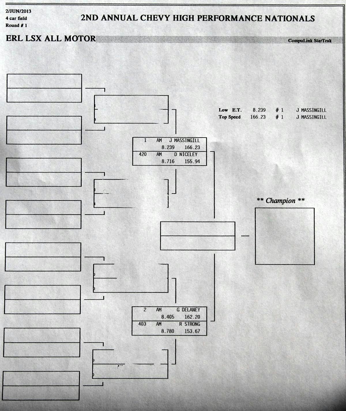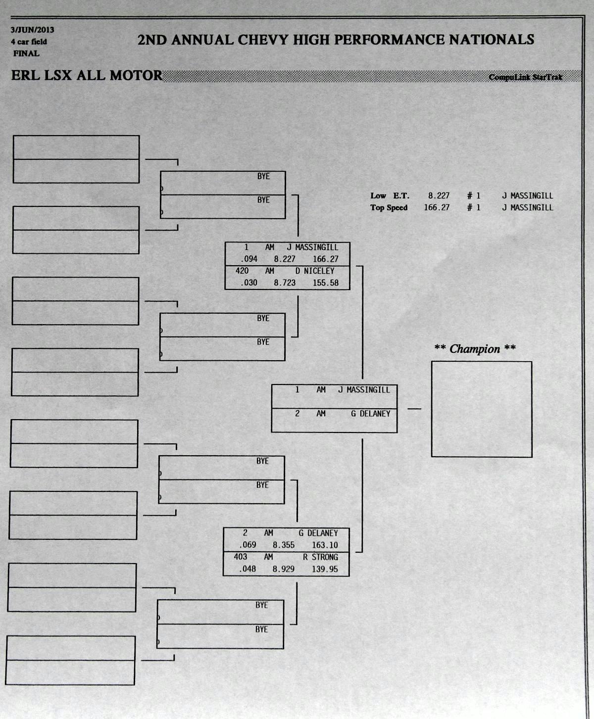 All Motor overdog Jud Massingill will face #2 qualifier Greg Delany in the make-up round at Indy. With a four-car field, the naturally-aspirated racers had but a single round of competition here in Commerce. Massingill drove around a bit of a holeshot from Danny Niceley, 8.227 to 8.723, recording the fast past of eliminations in the process, while Delaney's 5th Gen Camaro was just too, ahem, strong for Robert Strong's Monte Carlo.
