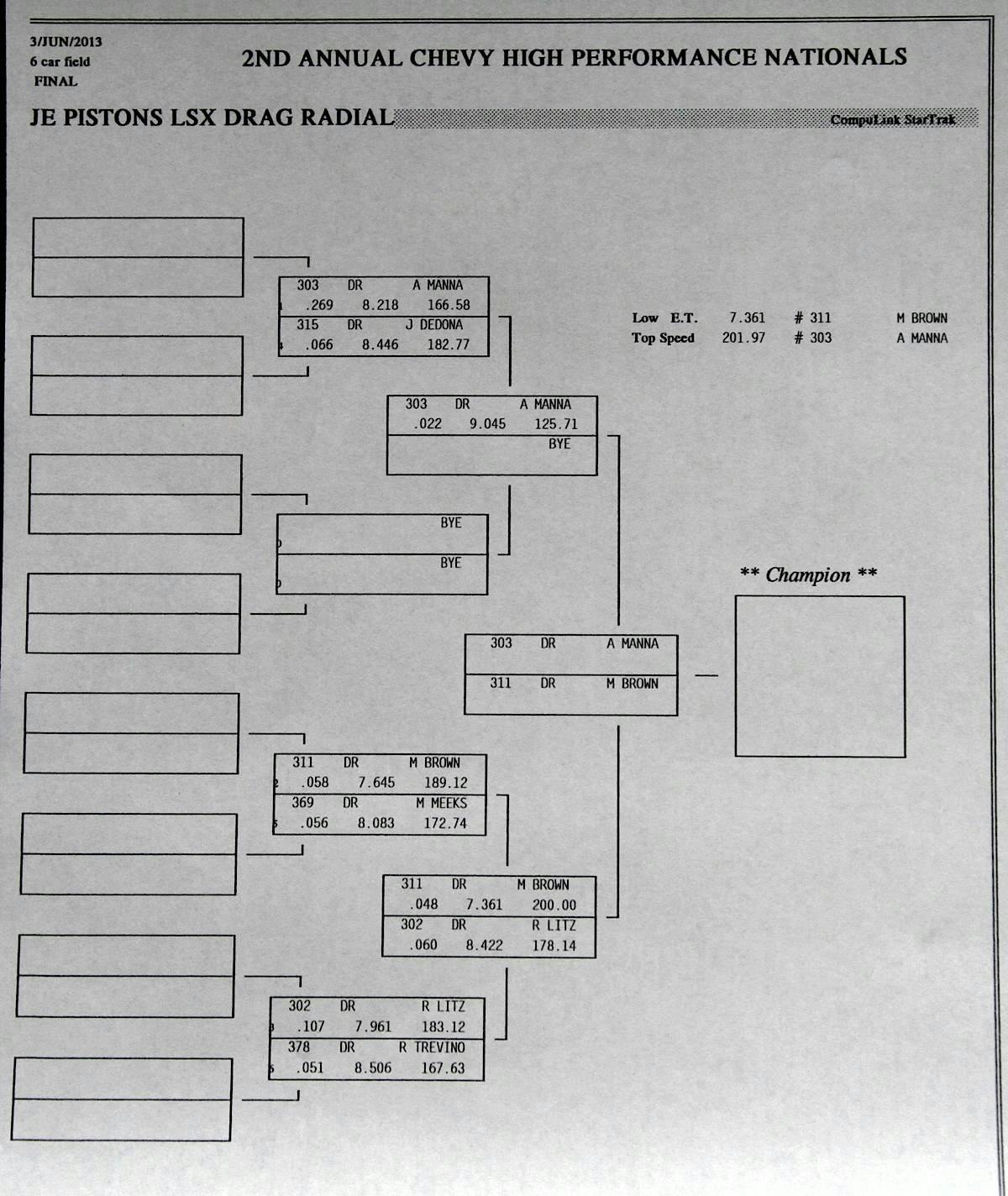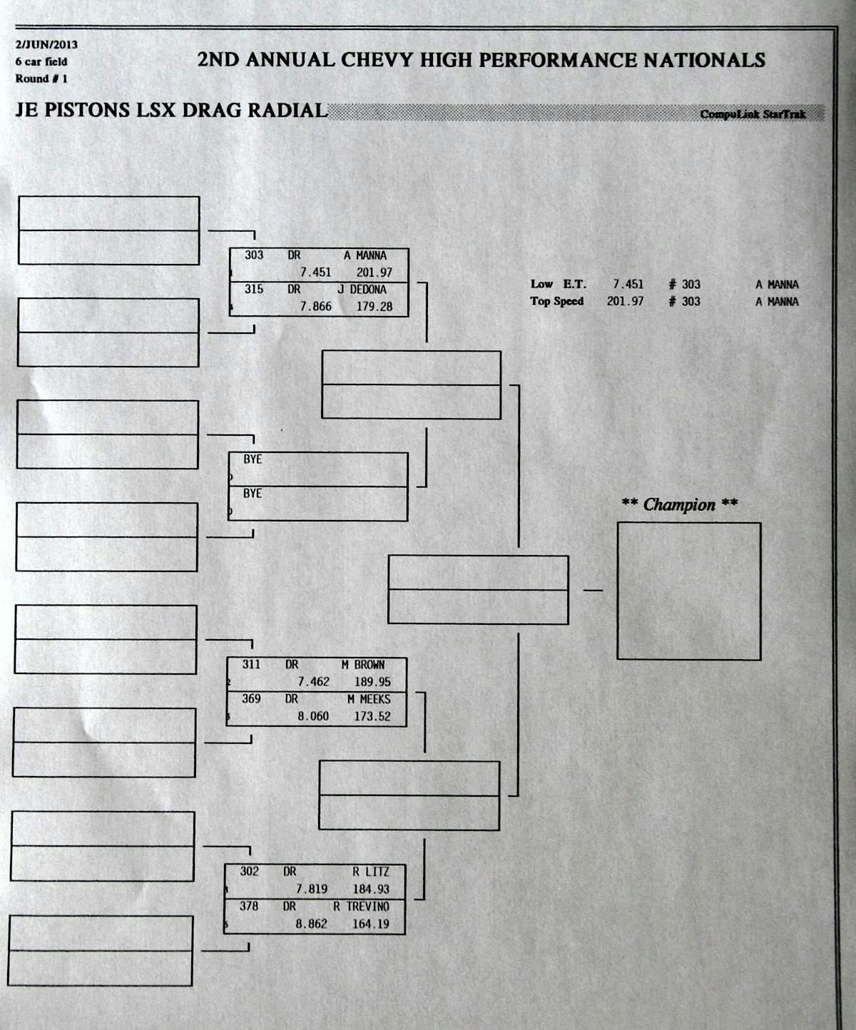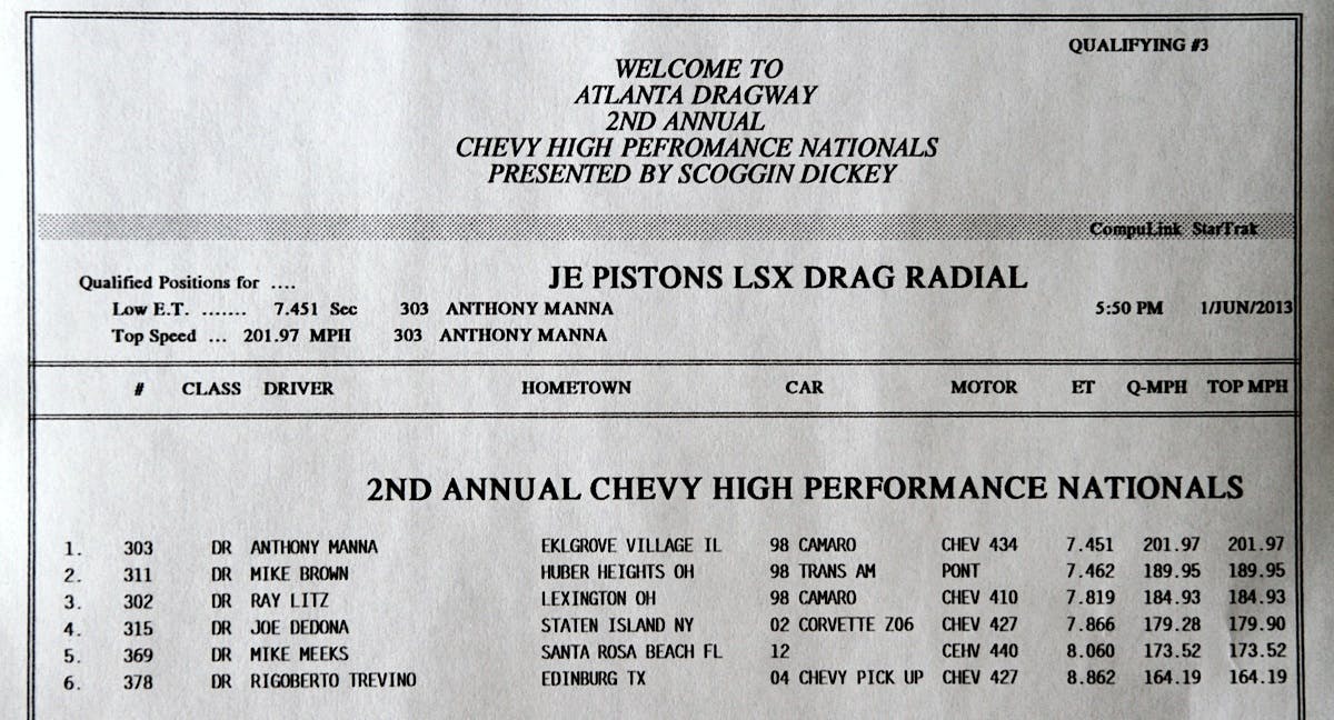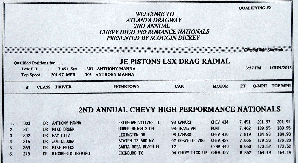 Anthony Manna leads the Drag Radial field going into tomorrow’s eliminations. Mike Brown and Ray Litz round out the top half of the six-car field, and all three are piloting ’98 F-bodies. Coincidence? Yes. Definitely.