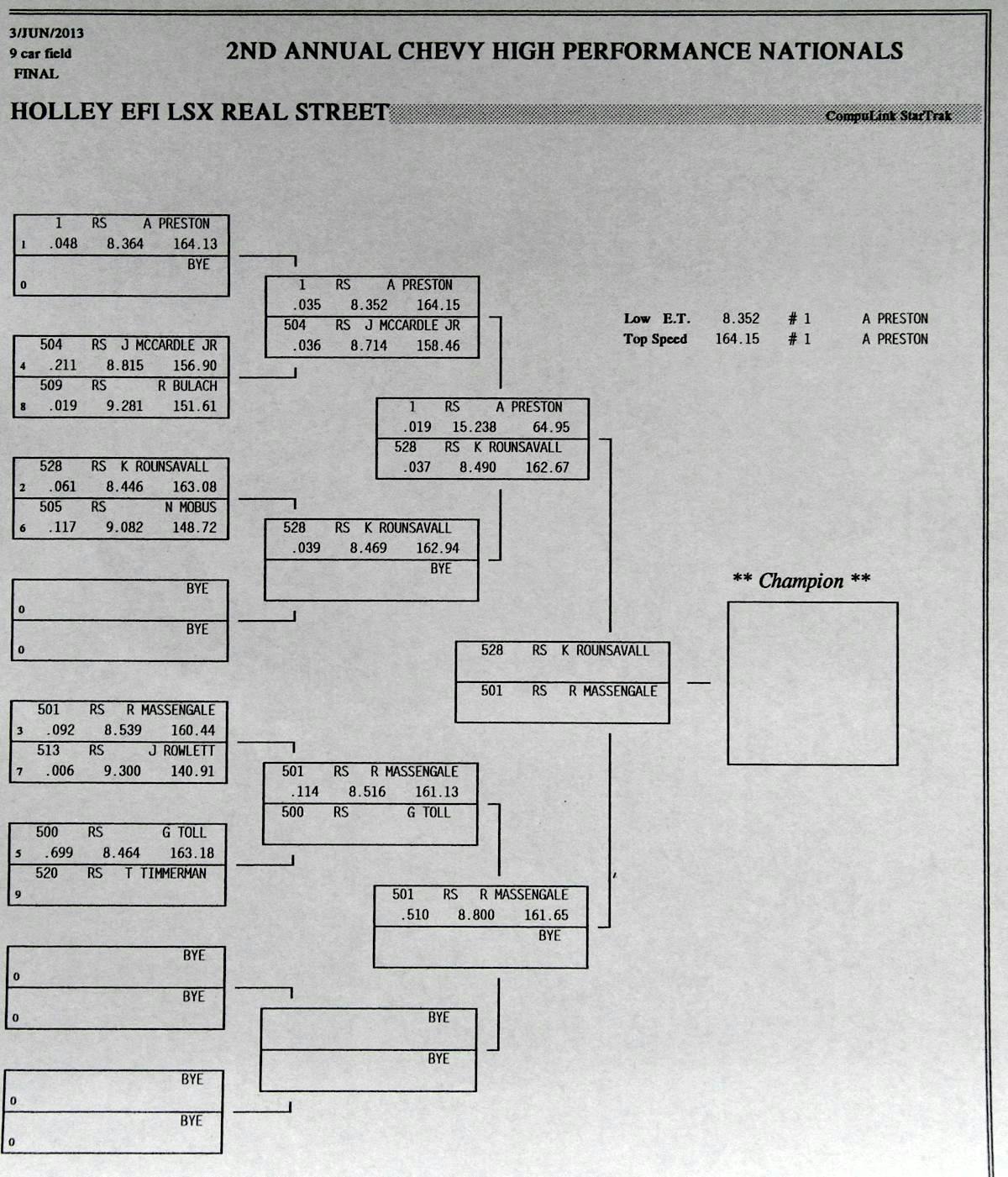 The Real Street final will pair Rodney Massengale's Corvette against Kevin Rounsavalle's Camaro. Rounsavall advanced past Nick Mobus with a clean first round victory, then cracked off a bracket-consistent second round competition bye before coming up against defending class champ Adam Preston in the semis. Preston, coming off of what would turn out to be the quickest RS pass of eliminations, hit bad luck and bad traction straight from the get-go, and could only watch as Rounsavall's Camaro got small in the distance. Meanwhile, Massengale drove around a .006-.092 holeshotting in the opening round from James Rowlett, then got an early Christmas present when George Toll couldn't make the call for round two. That put Massengale into the third and final competition bye of the ladder, setting up the final round in Indy.