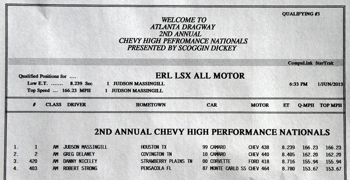 Jud Massingill continues to be the man to beat in LSX All Motor competition, qualifying the SAM Camaro on the pole with better than a tenth and a half cushion on the number 2 spot.