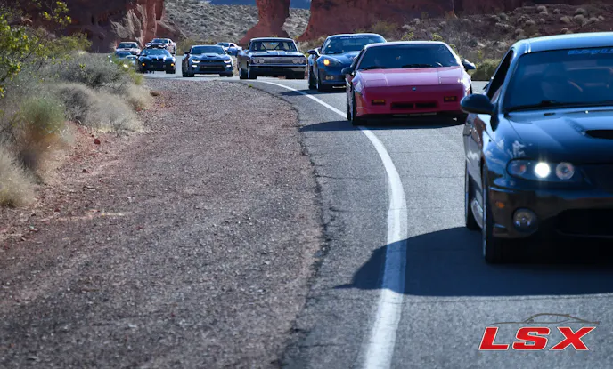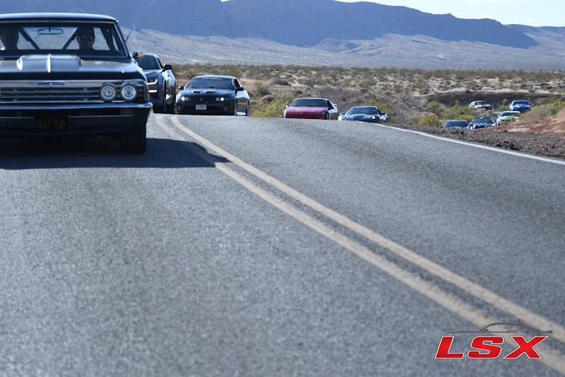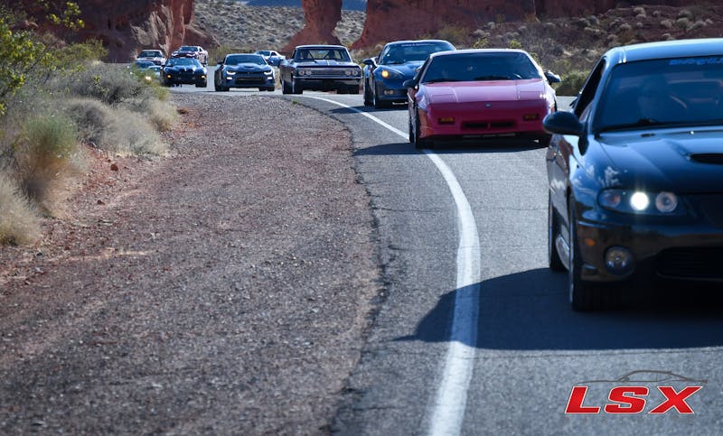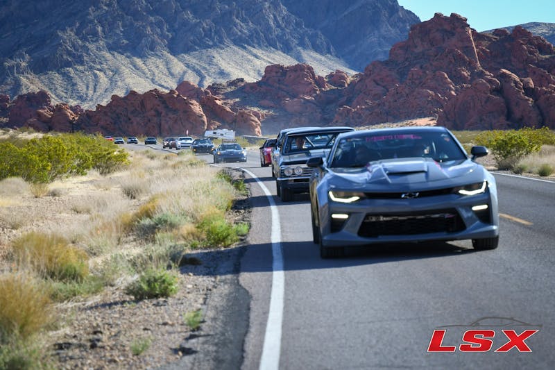 The LSX Magazine Valley of Fire Cruise kicked off today and was a fantastic scenic getaway. Even though it right outside of Las Vegas, you would never know it. Cars began showing up at three o’clock in the NASCAR parking lot, and we had a steady stream rolled in right up until our 4:00 departure. At 4:05, we headed out to the beautiful Valley of Fire state park. With about 35-40 cars in route, we made it to the park in about 30 minutes which made for an incredible drive.