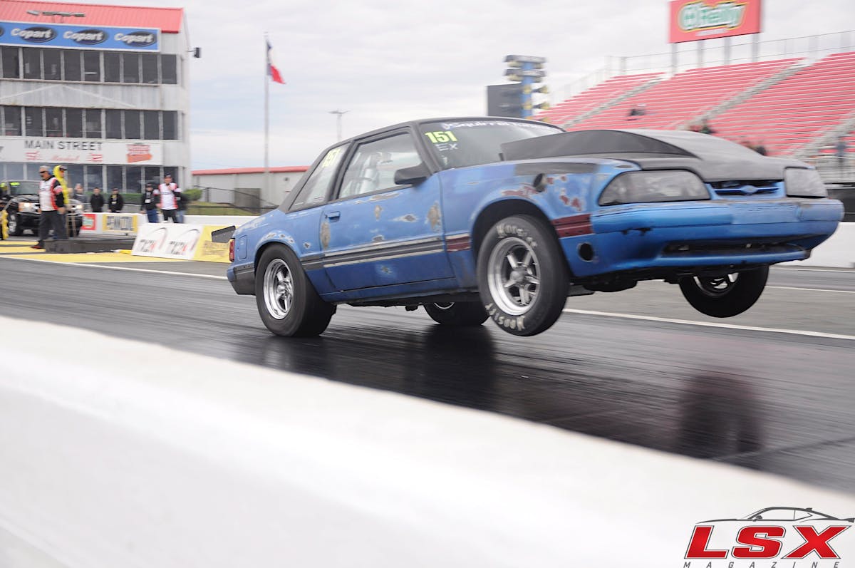 Beverly Feaster of Dedicated Motorsports out of Weatherford Texas was piloting her CTS-V in the Heavy Hitter class as well. The car has a Kong Performance ported blower and air intake, ported heads, cam, aftermarket exhaust system, 1700 Injector Dynamics fuel injectors, upper and lower pulley, ice tank to cool the blower air charge, LSR block, Driveshaft Shop axles, and driveshaft. The car weighs in at 4230-pounds with the factory seats removed with a race seat replacing the heavy drivers unit. This car had no problem yanking the wheels all weekend, and it sounds very, very angry when the throttle snaps. Beverly and her crew made some adjustments and hoped to better their 9.29 pass in eliminations.