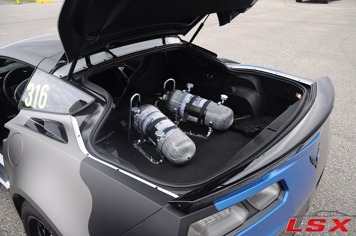 The nitrous system on the Z06 is made up of several different parts from various nitrous manufactures. The car has two Nitrous Express composite bottles with a set of Nitrous Outlet billet bottle brackets. The supercharger lid was sent off to the guys at Nitrous Outlet for a custom spray bar installation to help cool of the air charge while adding a little more power. The system is jetted for 200 horsepower and controlled by a NOS mini progressive controller. When the system is activated, a Lingenfelter LNC-2014 pulls timing out of the tune to make sure the system is safe. The only issue that Ryan has had with the nitrous is a a fouled spark plug which say a lot about the system since he has put at least 60 bottles through the car.