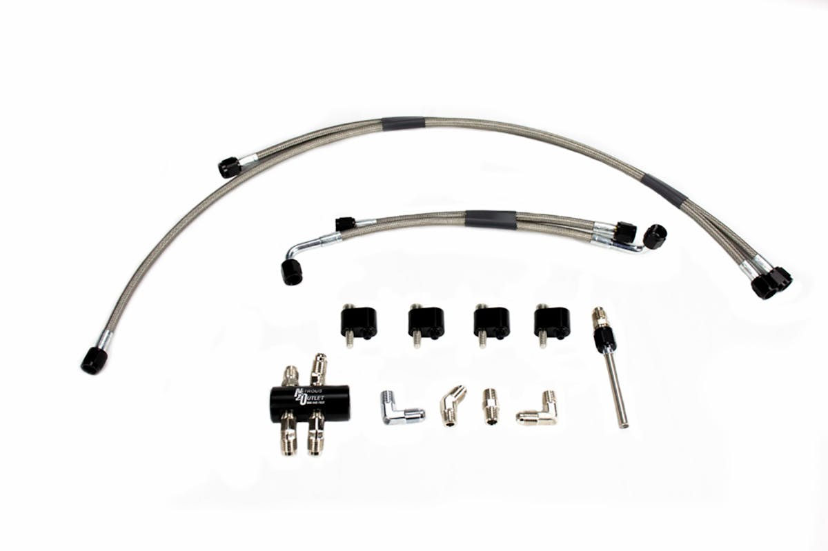 This kit includes a billet aluminum central distribution block, which is anodized black and laser marked. It also has braided stainless steel lines with anodized b-nuts that are rated over 12,000 psi. You can rest assured that these hoses are robust, and you will never have any problem with busting a hose, rust, or corrosion. While this kit looks great, it also fits perfectly. Nitrous Outlet custom fabricates each system for a custom fit that is easy to install and comes with all of the necessary hoses, fittings, and adapters.