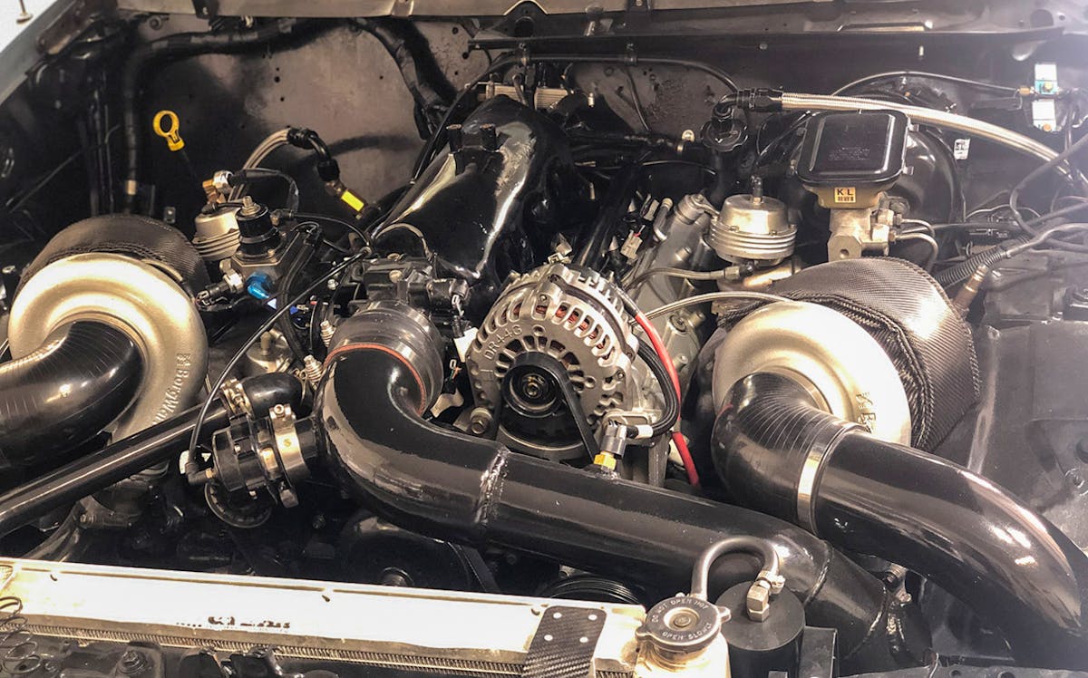 Shields’ Oldsmobile takes a slightly different approach to the engine combination. Everyone knows that junkyard LS engines love boost, and it’s a safe way to add some serious power to the platform. Shields’ started off with a stock-bottom-end 6.0-liter engine with a stage 2 cam, upgraded gaskets, and head bolts. He then added two BorgWarner 366SXE’s with billet wheels. This setup, with an inadequate fuel system and Holley EFI, the Olds makes enough power to crush the dreams of anyone that’s not making north of 900 horsepower.