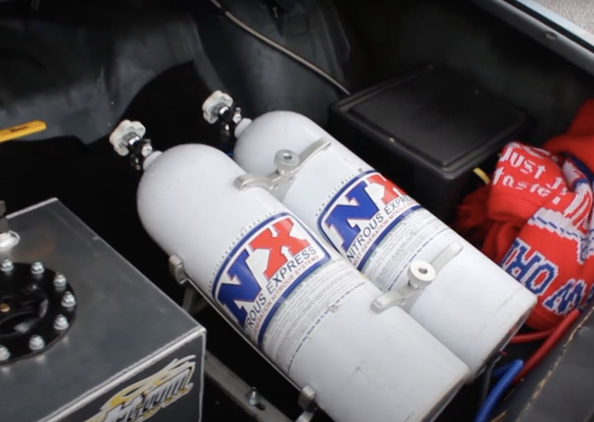 Dual Nitrous Express 15-pound bottles are nestled in the truck of the Church Lady Buick to make sure a 300 horsepower shot is always on tap.