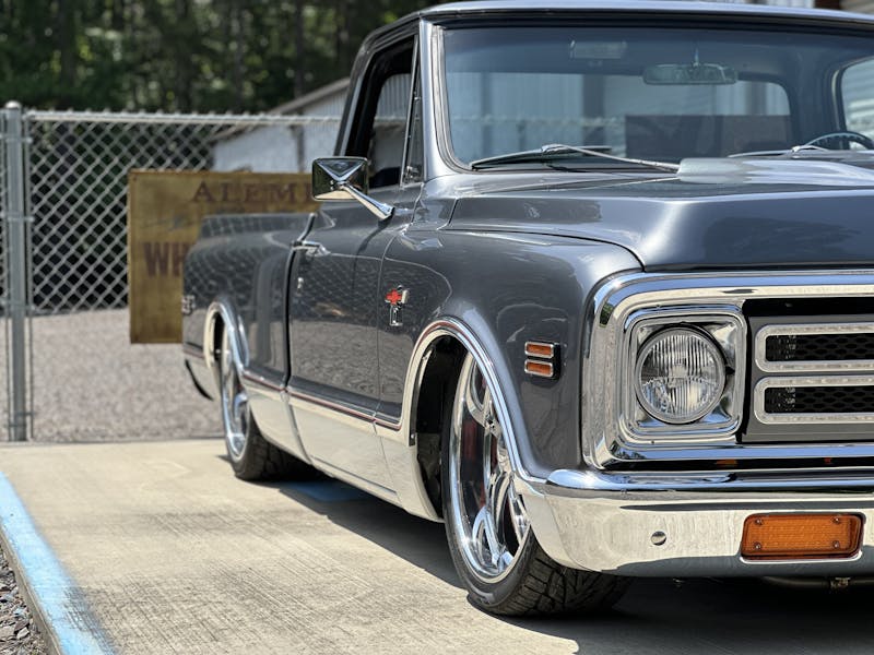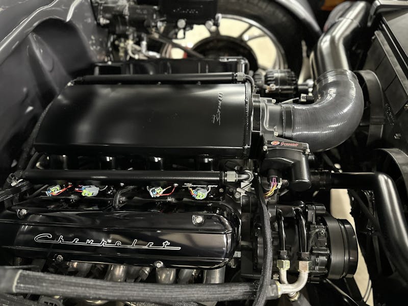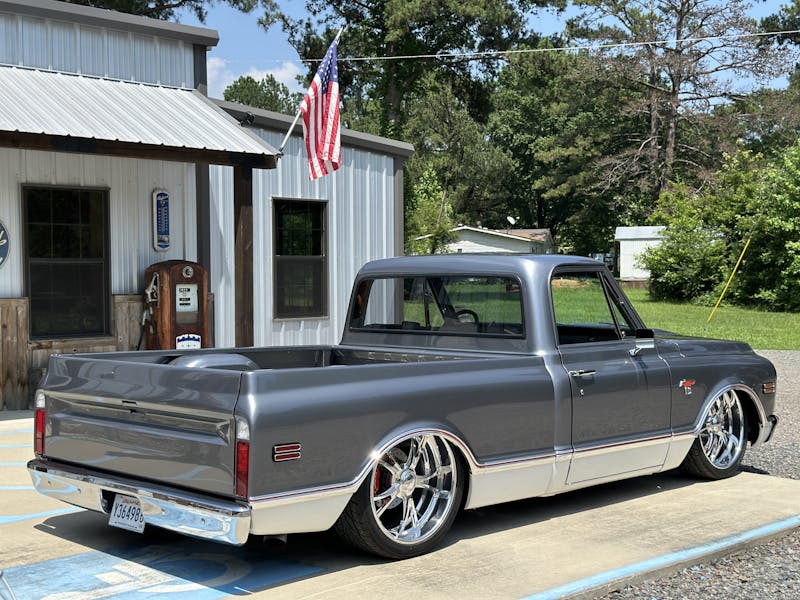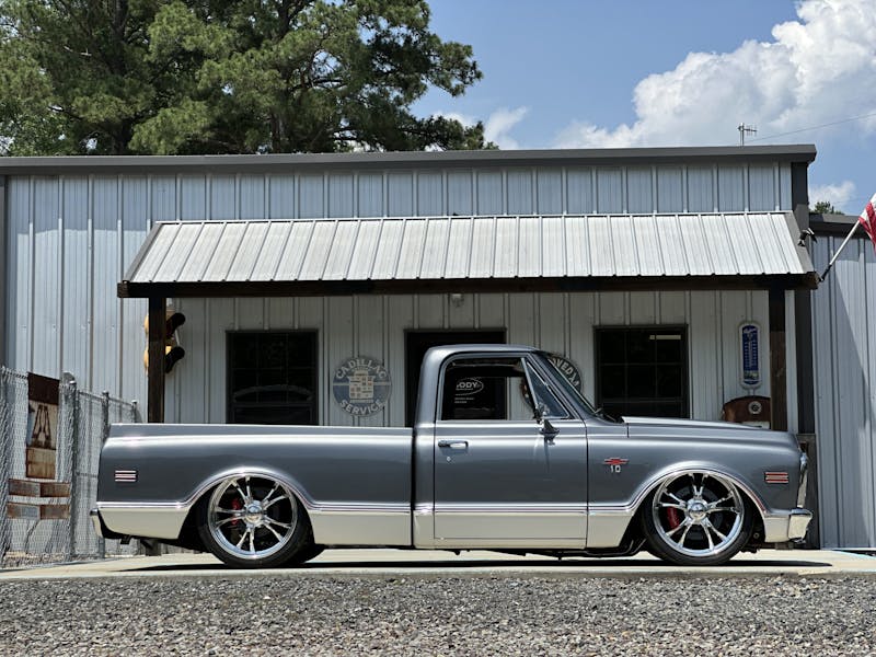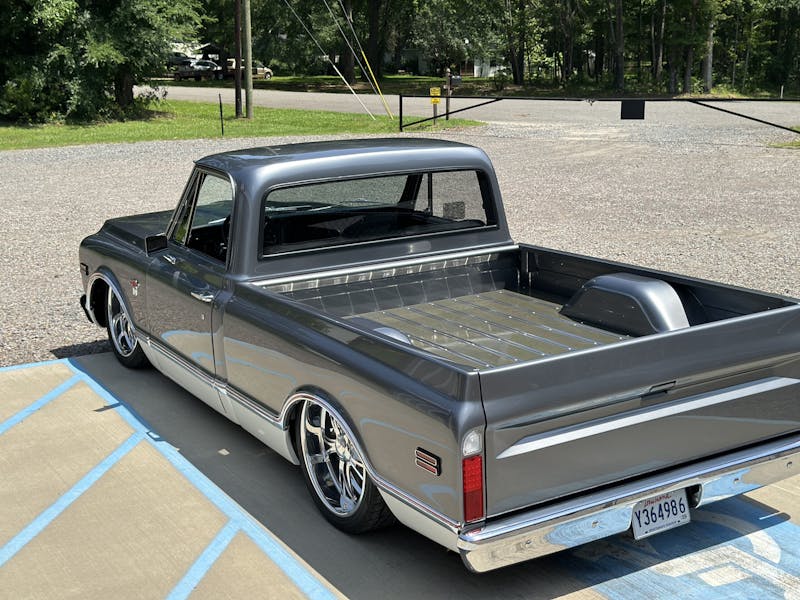 Under the hood, this 1970 Chevrolet C10 is equipped with a Chevrolet Performance LS 427 engine, nestled in a custom engine bay and paired with a GM Performance 4L75E transmission. The engine breathes through ceramic-coated 17/8-inch-diameter long-tube headers and a custom 3.0-inch exhaust system with Magnaflow mufflers, providing a deep, rumbling soundtrack that perfectly complements the truck’s classic styling. A Holley Sniper intake manifold and billet specialties valve covers add to the engine’s performance and visual appeal, while the DeWitt’s custom radiator and fans keep everything running cool. Derale oil coolers are tucked neatly under the truck to make sure all of the other fluids are kept cool. A Holley Terminator management system and a Painless Performance chassis wire harness control the engine and transmission, ensuring optimal performance and dependability.