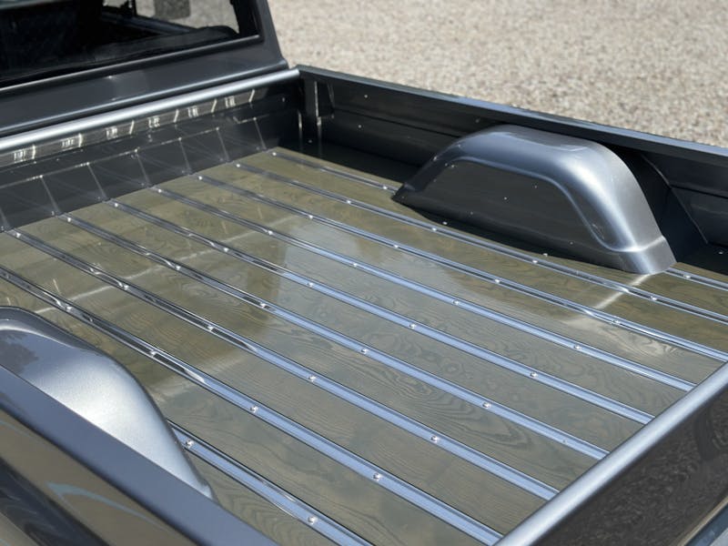 Every trim piece, from the chrome accents to the emblems, has been painstakingly replaced and polished to a brilliant shine, complementing the truck’s revised aesthetic while adding a touch of nostalgic charm. Even the most minute components – the new glass, the rubber seals – have been meticulously attended to, underscoring the shop’s relentless focus on detail and commitment to ensuring that every aspect of the truck is as pristine as it is functional. One of the truck’s most striking features is its elevated bed floor, crafted from polished stainless-steel strips and ash wood planks. This unexpected combination imbues the truck with a hint of rustic charm, creating a beautiful contrast with the sleek, modern paint job that adds depth and visual interest to the overall design.