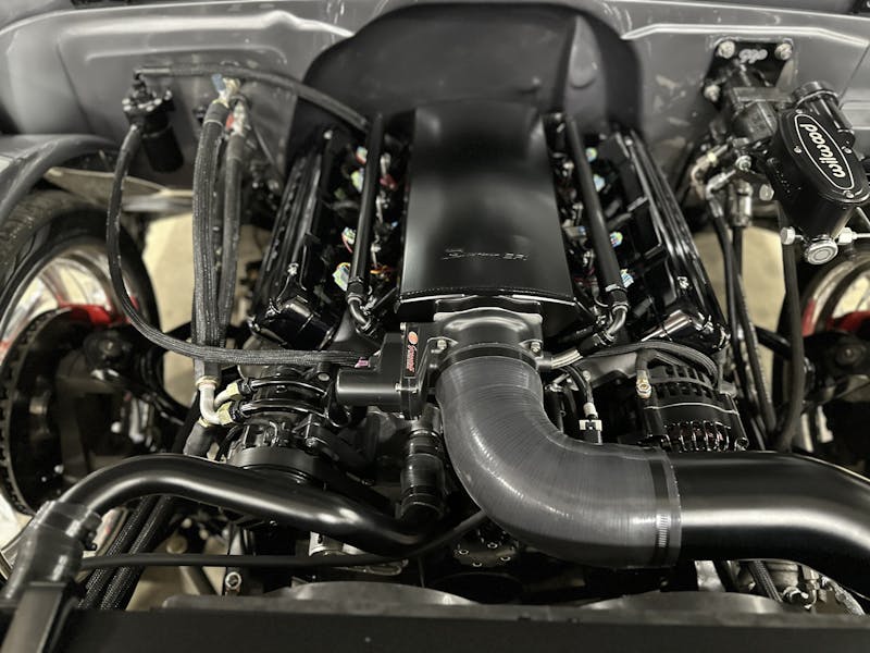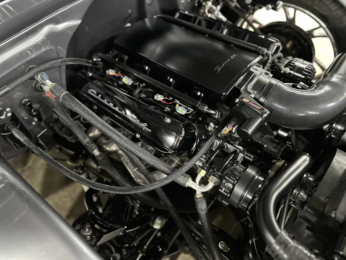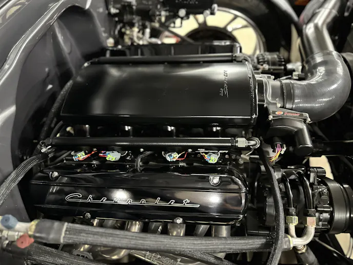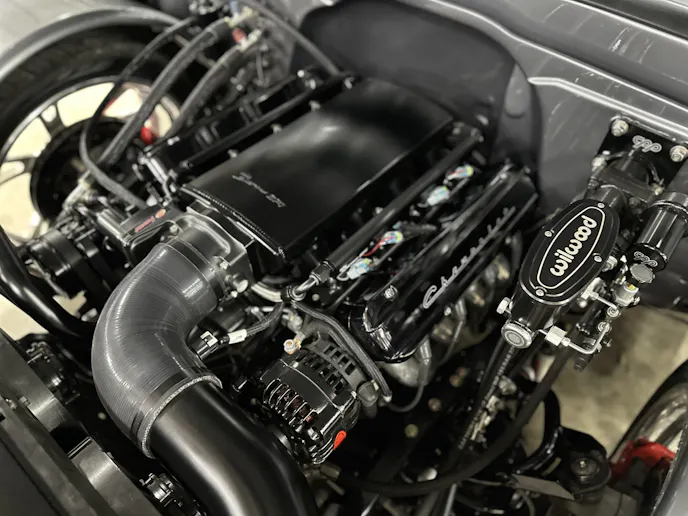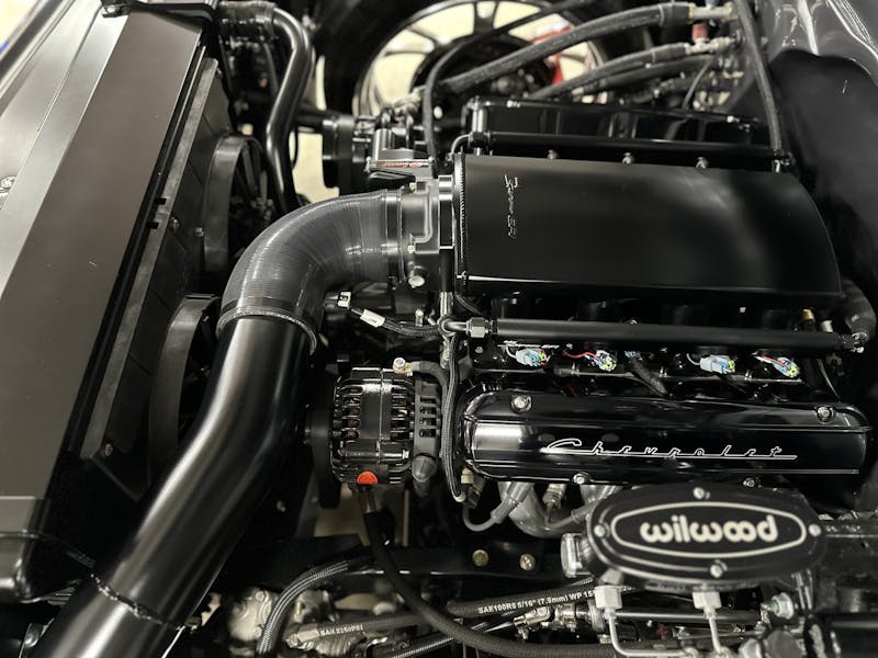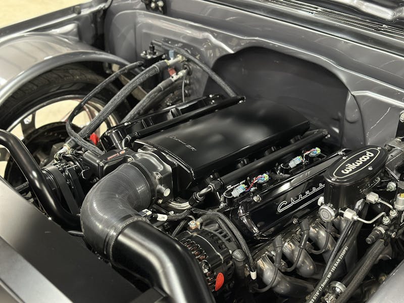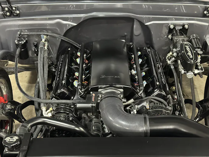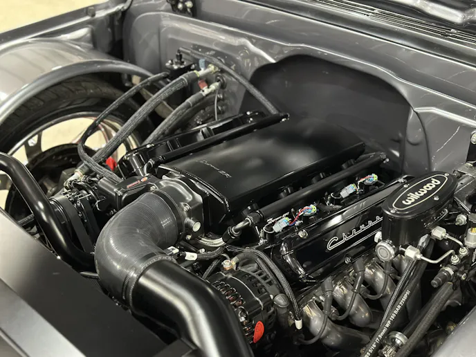 Under the hood, this 1970 Chevrolet C10 is equipped with a Chevrolet Performance LS 427 engine, nestled in a custom engine bay and paired with a GM Performance 4L75E transmission. The engine breathes through ceramic-coated 17/8-inch-diameter long-tube headers and a custom 3.0-inch exhaust system with Magnaflow mufflers, providing a deep, rumbling soundtrack that perfectly complements the truck’s classic styling. A Holley Sniper intake manifold and billet specialties valve covers add to the engine’s performance and visual appeal, while the DeWitt’s custom radiator and fans keep everything running cool. Derale oil coolers are tucked neatly under the truck to make sure all of the other fluids are kept cool. A Holley Terminator management system and a Painless Performance chassis wire harness control the engine and transmission, ensuring optimal performance and dependability.
