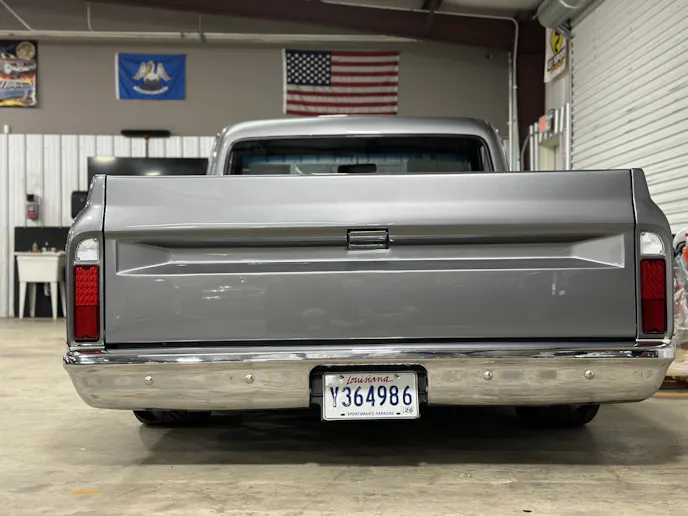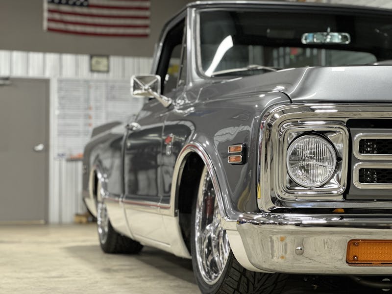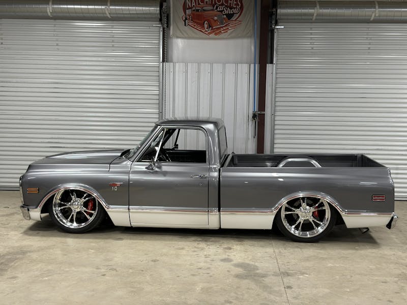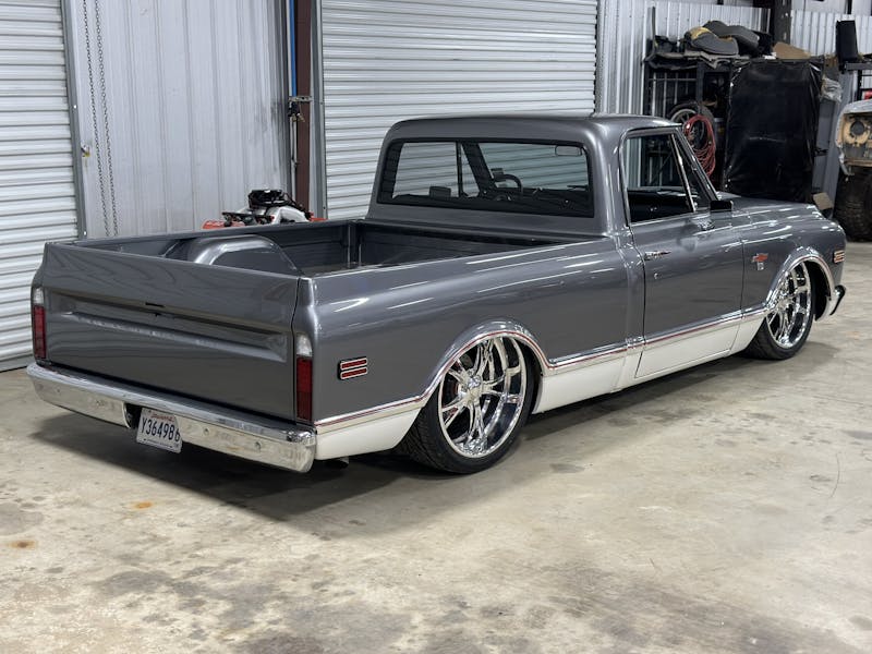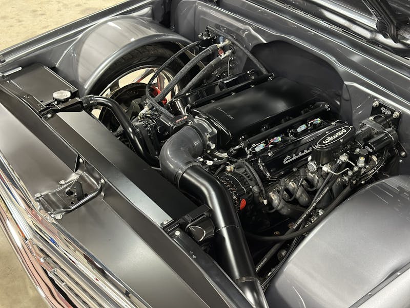 Under the hood, this 1970 Chevrolet C10 is equipped with a Chevrolet Performance LS 427 engine, nestled in a custom engine bay and paired with a GM Performance 4L75E transmission. The engine breathes through ceramic-coated 17/8-inch-diameter long-tube headers and a custom 3.0-inch exhaust system with Magnaflow mufflers, providing a deep, rumbling soundtrack that perfectly complements the truck’s classic styling. A Holley Sniper intake manifold and billet specialties valve covers add to the engine’s performance and visual appeal, while the DeWitt’s custom radiator and fans keep everything running cool. Derale oil coolers are tucked neatly under the truck to make sure all of the other fluids are kept cool. A Holley Terminator management system and a Painless Performance chassis wire harness control the engine and transmission, ensuring optimal performance and dependability.