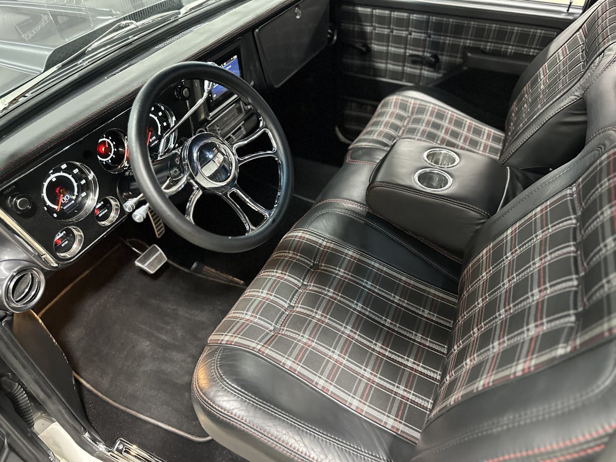 Under the hood, this 1970 Chevrolet C10 is equipped with a Chevrolet Performance LS 427 engine, nestled in a custom engine bay and paired with a GM Performance 4L75E transmission. The engine breathes through ceramic-coated 17/8-inch-diameter long-tube headers and a custom 3.0-inch exhaust system with Magnaflow mufflers, providing a deep, rumbling soundtrack that perfectly complements the truck’s classic styling. A Holley Sniper intake manifold and billet specialties valve covers add to the engine’s performance and visual appeal, while the DeWitt’s custom radiator and fans keep everything running cool. Derale oil coolers are tucked neatly under the truck to make sure all of the other fluids are kept cool. A Holley Terminator management system and a Painless Performance chassis wire harness control the engine and transmission, ensuring optimal performance and dependability.