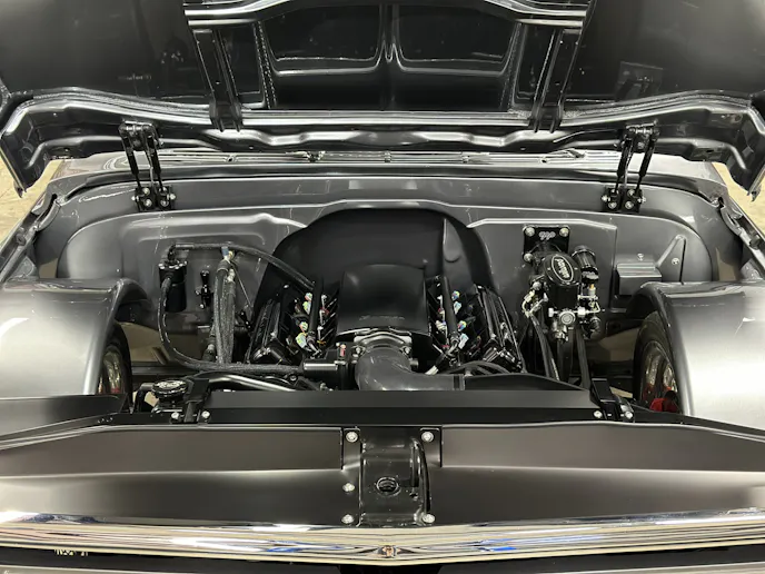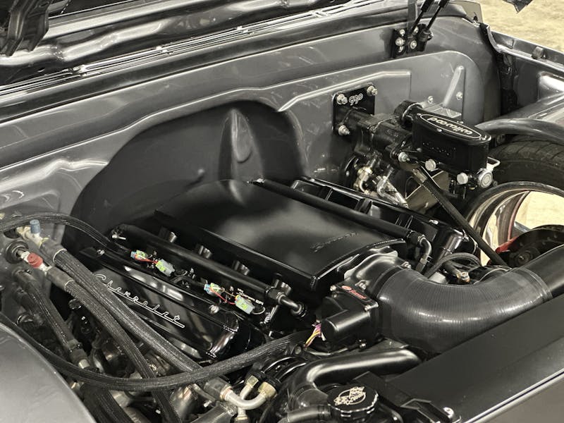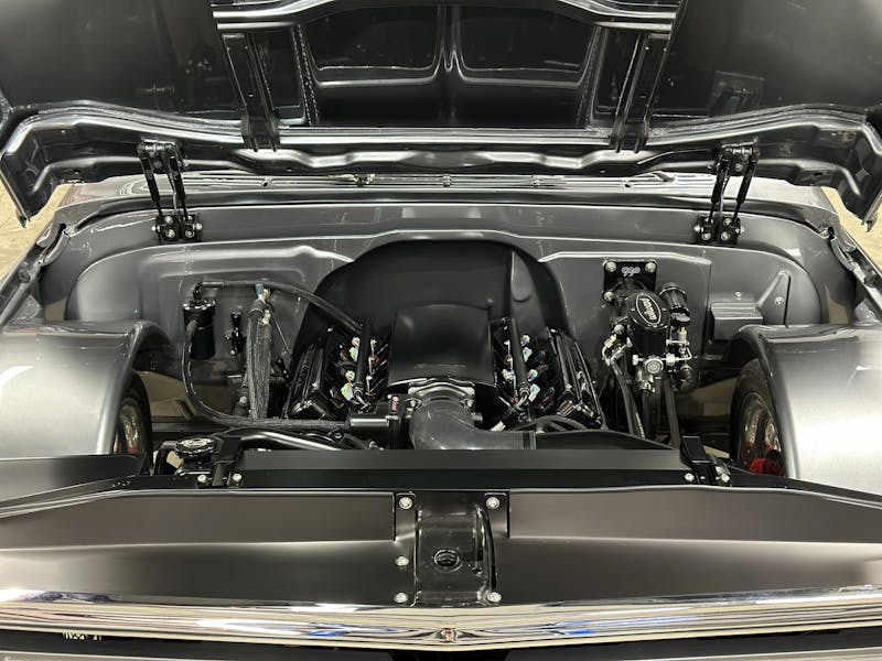 Under the hood, this 1970 Chevrolet C10 is equipped with a Chevrolet Performance LS 427 engine, nestled in a custom engine bay and paired with a GM Performance 4L75E transmission. The engine breathes through ceramic-coated 17/8-inch-diameter long-tube headers and a custom 3.0-inch exhaust system with Magnaflow mufflers, providing a deep, rumbling soundtrack that perfectly complements the truck’s classic styling. A Holley Sniper intake manifold and billet specialties valve covers add to the engine’s performance and visual appeal, while the DeWitt’s custom radiator and fans keep everything running cool. Derale oil coolers are tucked neatly under the truck to make sure all of the other fluids are kept cool. A Holley Terminator management system and a Painless Performance chassis wire harness control the engine and transmission, ensuring optimal performance and dependability.