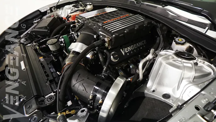 To top off the newly-built long block, a Magnuson 2650R was selected with a 2.75-inch upper pulley and 9.45-inch lower. This combination is good for 21-pounds of boost. A custom ice tank was used with a high-flow water pump to cool down the air charge after it passes through a massive 112mm Nick Williams throttle body via a 5-inch VR intake with interchangeable bell mouth. To get all of that air out of the engine, Vengeance used a set of Kooks headers attached to a stock X-pipe. A 3-inch Borla ATAK system was bolted on to calm the tone of the boosted ZL1.