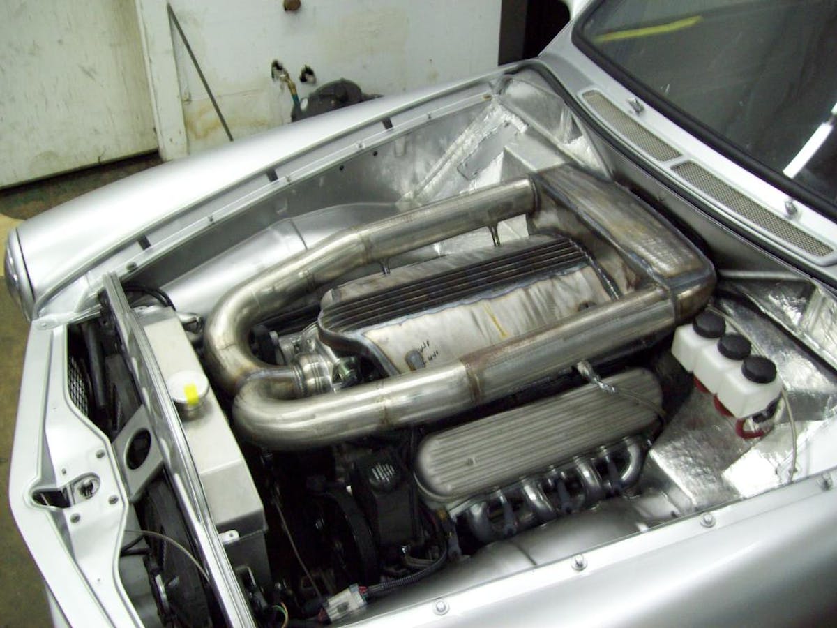 The first place spent exhaust gasses go are a set of block-hugging Swedish Ops/Sanderson headers. From there, exhaust travels down the system through an X-pipe, then into dual MagnaFlow mufflers, and out just in front of the rear wheels through side exiting exhaust tips that came from a late model Pontiac Grand Prix. The tips are actually encircled in bodywork, and the tip-to-body clearances are so tight that Jackson solidly mounted the muffler and exit piping assembly to the body so there wasn’t any rattling. Any exhaust movement is handled by a section of flex pipe.